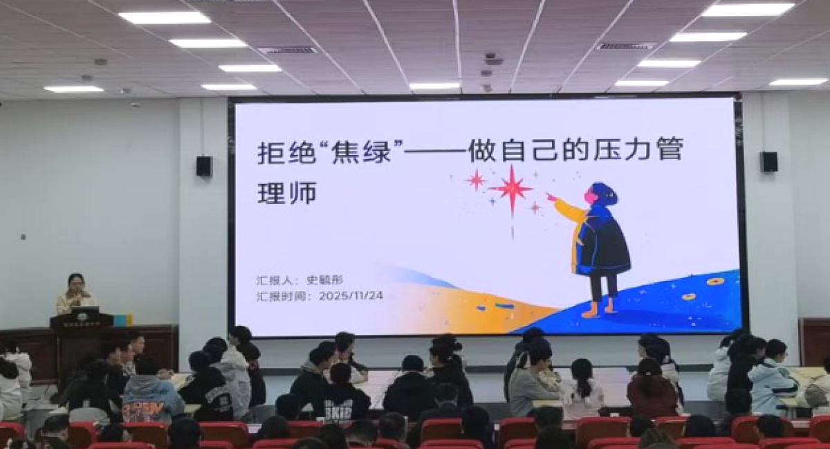 史毓彤老师以“拒绝‘焦绿’——做自己的压力管理师”为主题,聚焦学生常见的焦虑问题,精准捕捉考试压力、作业负担、人际交往等“焦绿”瞬间,带来解析焦虑本质,区分适度焦虑与过度焦虑的不同价值。随后,通过“焦虑信箱”为学生提供倾诉平台,并分享了“4-7-8呼吸法、转换场景、积极转念、任务拆解”四大实用技巧,帮助学生科学管理压力,以从容心态应对学习生活中的挑战。