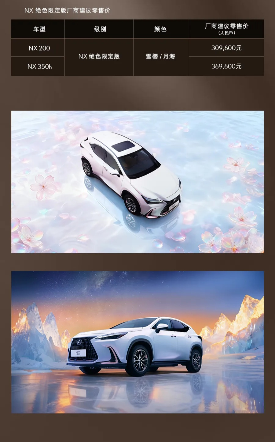 雷克萨斯扔出大招——NX绝色限定版正式上市,30.96万起的定价搭配“雪樱”“月海”两款专属配色,这次新车的核心亮点全在颜值上,“雪樱”是带粉调的温柔白,“月海”是深邃质感的深色,车身还点缀了极光粉装饰件,精致感拉满。动力分两种选择,2.0L自吸版30.96万够日常代步,2.5L混动版36.96万,动力和油耗表现更优,两者差价6万。这台车更适合看重颜值、追求省心的消费者,纠结的话不妨先对比下同价位的奥迪Q5L和国产新势力。