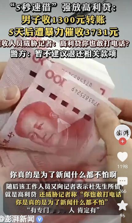 防不胜防!河南濮阳,一男子收到1300元,他一查账单,转钱的人他不认识,男子认为,天上没有掉馅饼的好事,他立刻报警,到了第4天,有人打来电话,要他还2430元,男子拒绝,对方告诉男子,是他点了短信链接,自愿 刷 脸 借了平台的钱,为期5天,如果今天不还,明天就不是这个数了!第5天时,催收电话再度打来,要他还3731元,对方威 胁: 再不还钱,要你全家不得安生!男子崩溃了。 在河南濮阳的一个普通夜晚,杜先生像往常一样坐在自家的客厅里看电视,享受着难得的闲暇时光。突然,他的手机提示银行卡收到一笔1300元的转账。 乍一看,心里虽然有些惊讶,但也并没有多想,因为日常生活中,偶尔收到转账并不罕见。只是当他仔细查看账单时,他发现转账人竟然是一个自己根本不认识的名字——杨某。 杜先生立刻警觉起来。他心里清楚,“天上不会掉馅饼”,这笔钱很可能背后有问题。 尤其是最近他也听说过一些诈骗案例,很多诈骗手段都是通过假冒转账来诱导受害人进一步操作。他立刻选择报警,将这件事交给警方处理。 大约四天后,杜先生的电话响了。电话那头,一个陌生的声音冷冷地告诉他:“你需要还2430元。” 杜先生顿时愣住了,这个数额与他收到的1300元完全不符,他质问对方:“我根本没有点过你们的链接,也没有借过钱。” 对方却坚称杜先生是自愿通过短信链接,在某个借贷平台上刷脸借了1300元,而且还限定了还款期限——五天内还清,否则第二天利息会更高。 杜先生心里更清楚,这绝对不可能是自己操作的事情,但电话里的催收者声称他已经在平台上借了钱,而且态度十分强硬。 接下来的几天,催收电话再次打来。这一次,对方不仅提高了欠款金额——3731元,还威胁杜先生:“再不还钱,你全家都不得安生!” 杜先生感到前所未有的压力和恐慌,他感到自己被卷入了一场巨大的阴谋中,完全无力反抗。 无奈之下,杜先生联系了当地记者,希望借助媒体的力量,让事情曝光。记者拨通了催收者的电话,试图了解事情真相。 电话那头的人依然坚持称杜先生自愿借款,并态度嚣张:“敢不还钱,我们有的是专业催收人员!” 甚至还对记者威胁:“高利贷你也敢打电话?你真的是为了新闻什么都不怕啊?” 记者并没有被吓住,而是开始通过互联网核实该借贷平台的信息。然而,无论是公司注册信息还是平台应用,完全找不到催收者所说的“某某速借”存在的任何证据。 催收电话也不是正规公司的号码,平台应用在手机上无法下载,甚至连工商注册信息都没有。 杜先生在心里不断权衡,他清楚自己从未借过这笔钱,更没有操作过任何链接。 他收到的1300元仍然安然无恙地停留在自己的账户里,但对方却以高利贷的方式不断加收利息,使欠款金额越来越高。他焦虑、恐慌,却又无能为力,只能等待警方的进一步调查。 在整个事件过程中,杜先生感到自己被卷入了一个复杂而危险的骗局中。 骗子利用人们对借贷和银行业务不熟悉的心理,通过假转账、短信链接和“刷脸借款”等手段,制造出看似合理的借款记录,然后利用恐吓和威胁催收,企图逼迫受害者缴纳高额资金。 “我从来没有点过任何链接,也没有同意借款,这一切都是对我的恶意陷害。” 杜先生对记者说道。他不仅担心自己可能遭受的经济损失,更害怕诈骗集团进一步的恐吓。他形容自己这几天的心理状态就像是身处悬崖边,随时可能坠落,却又无法挣脱。 如今,杜先生仍在与警方保持沟通,配合调查,希望彻底查清这笔“莫名其妙”的借款来源。他意识到,遇到这种情况最重要的是冷静应对,不被恐吓所左右。 通过媒体曝光,也希望能让更多人警惕这种新型网络诈骗,提醒大家不要轻信陌生转账,不随意点击短信链接,更不要被所谓的催收电话吓倒。 杜先生说:“我希望通过我的遭遇,让更多人明白,面对陌生的钱和陌生的电话,千万不要慌,要相信法律和警方,而不是那些所谓‘专业催收人员’的威胁。”