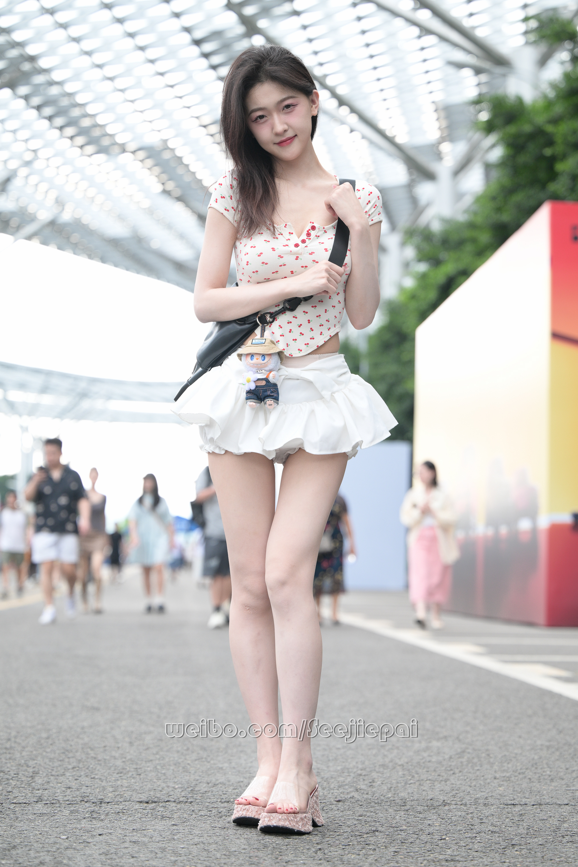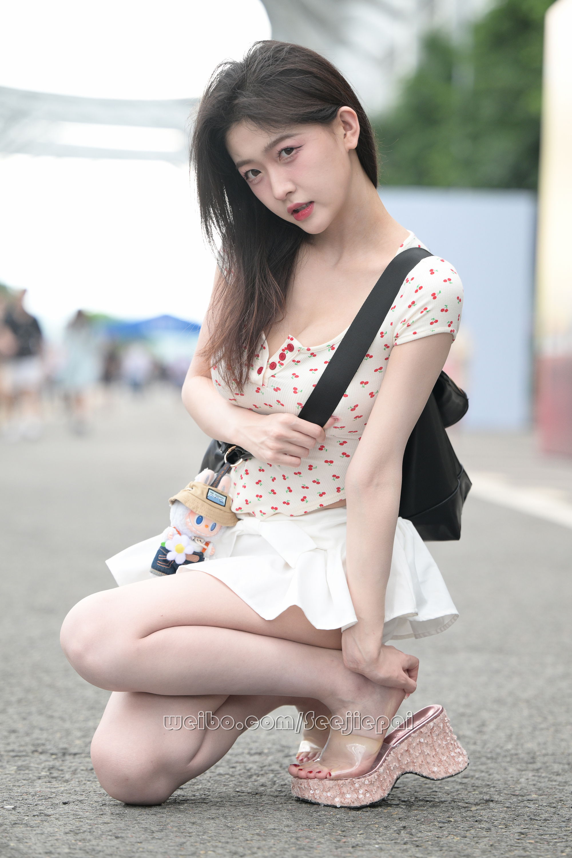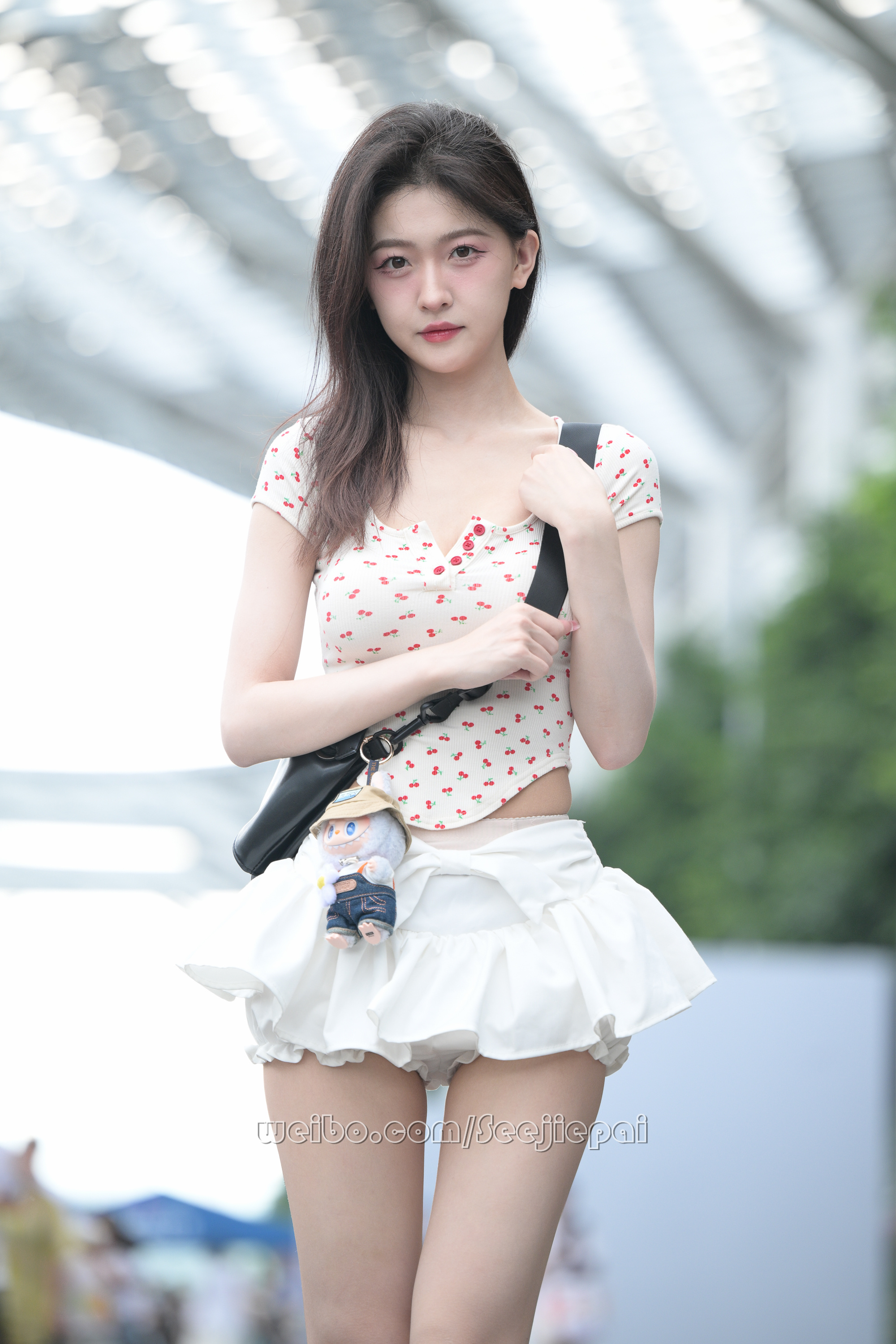 清新夏日穿搭,绿意盎然背景,少女感十足!街拍高清美女