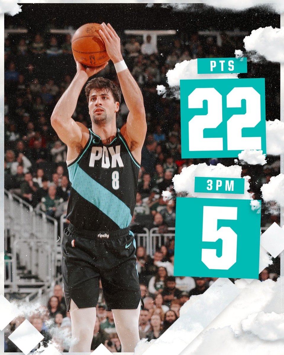 开拓者官方账号报道。德尼·阿夫迪亚在NBA常规赛中代表波特兰开拓者队出战,全场贡献22分、5次助攻、4个篮板,三分球7投5中,表现持续亮眼。