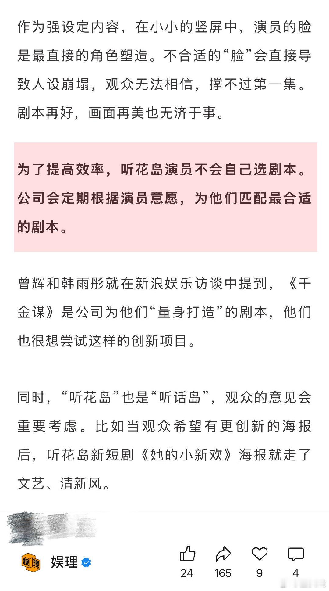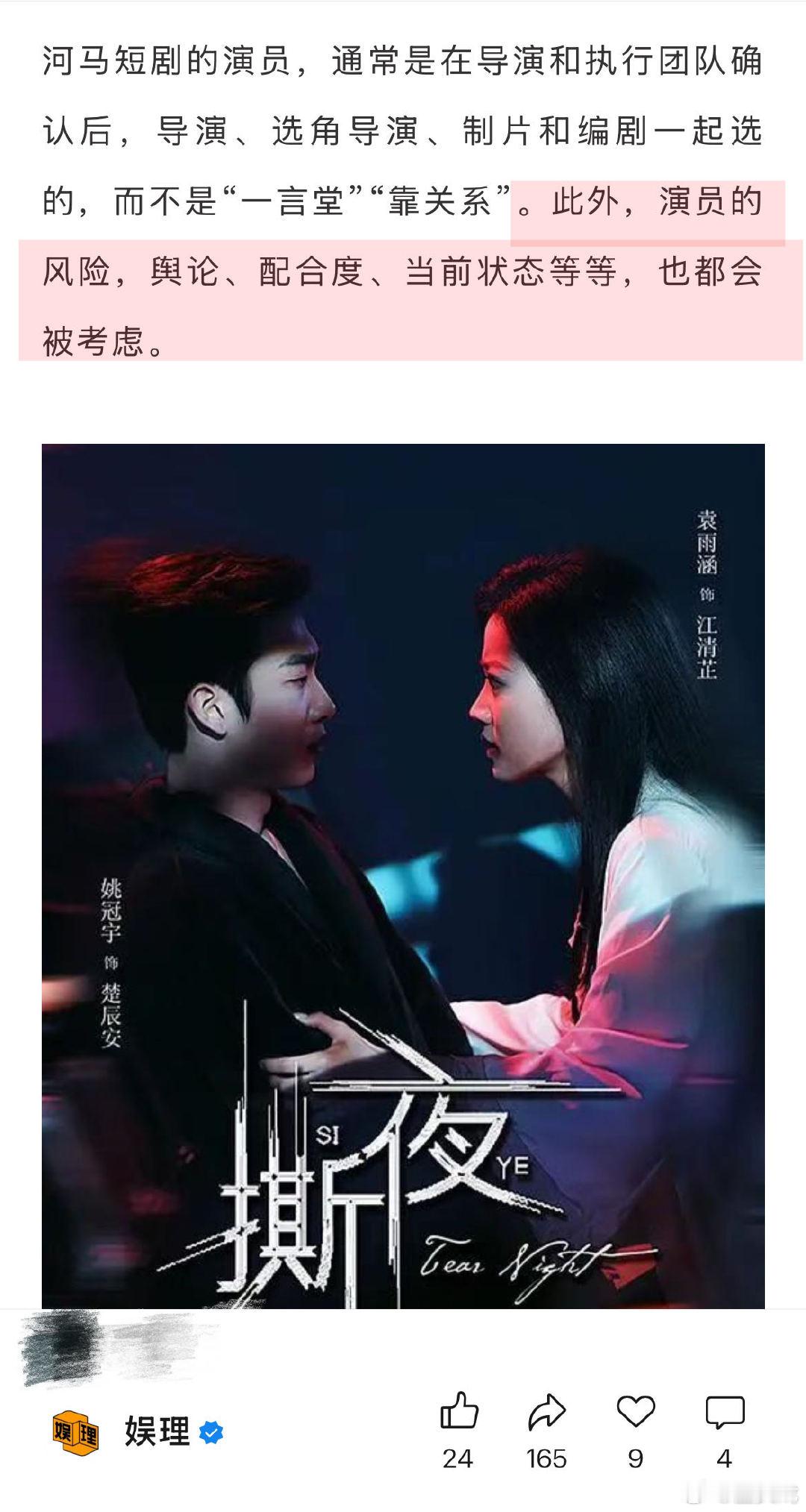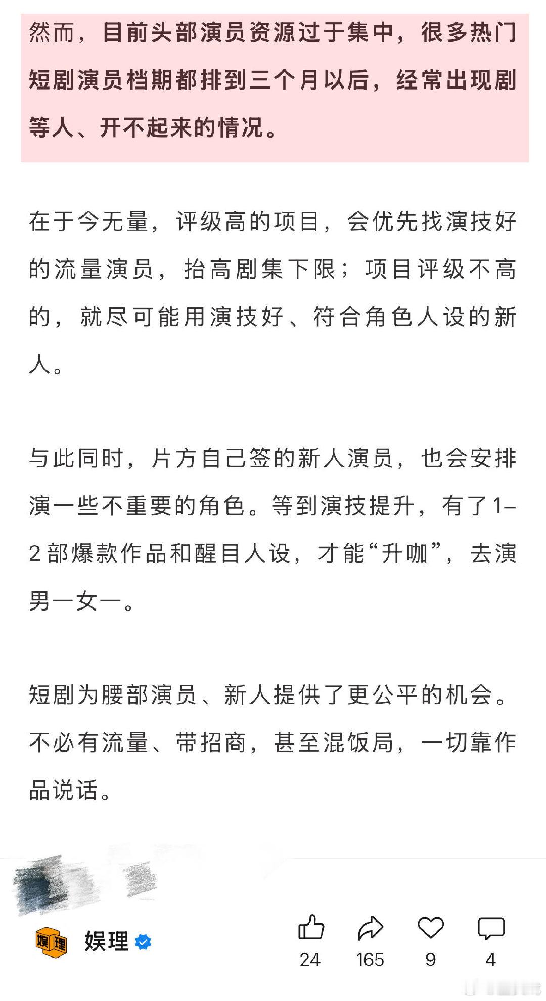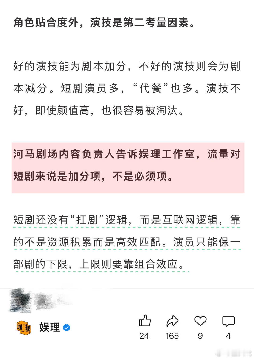 除角色贴合度外,演技也是短剧选角的第二考量因素。短剧演员多,“代餐”也多。演技不好,即使颜值高,也很容易被淘汰。河马剧场内容负责人表示:流量对短剧来说是加分项,不是必须项。短剧还没有“扛剧”逻辑,而是互联网逻辑,靠的不是资源积累而是高效匹配。演员只能保一部剧的下限,上限则要靠组合效应。↓