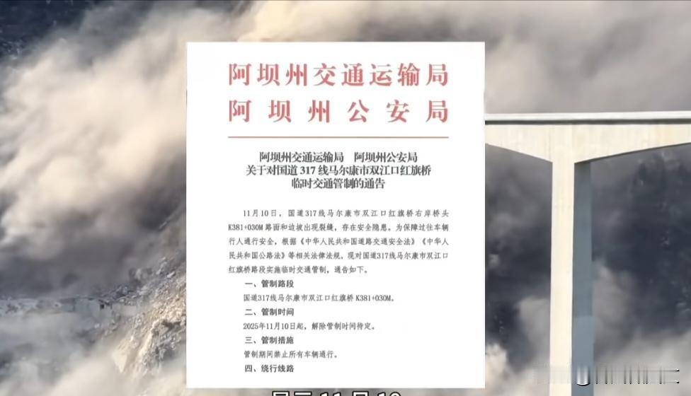 四川阿坝一大桥发生垮塌,官方回应:此前已发现险情并实施交通管制,无人员伤亡 11月11日,四川省阿坝州马尔康市境内的红旗大桥发生垮塌。视频显示,大桥靠近山坡的一侧突然坍塌,现场尘烟滚滚,场面十分震撼。 据马尔康市交通运输局工作人员介绍,双江口水电站红旗大桥在10日巡线时发现边坡存在裂缝险情,随即采取了交通管制措施。11日,该边坡发生垮塌,并非网传的定向爆破。工作人员强调,现场无人员伤亡。 目前,相关部门已介入调查,具体原因及后续处理方案将及时向社会公布。大桥塌垮 垮塌大桥
