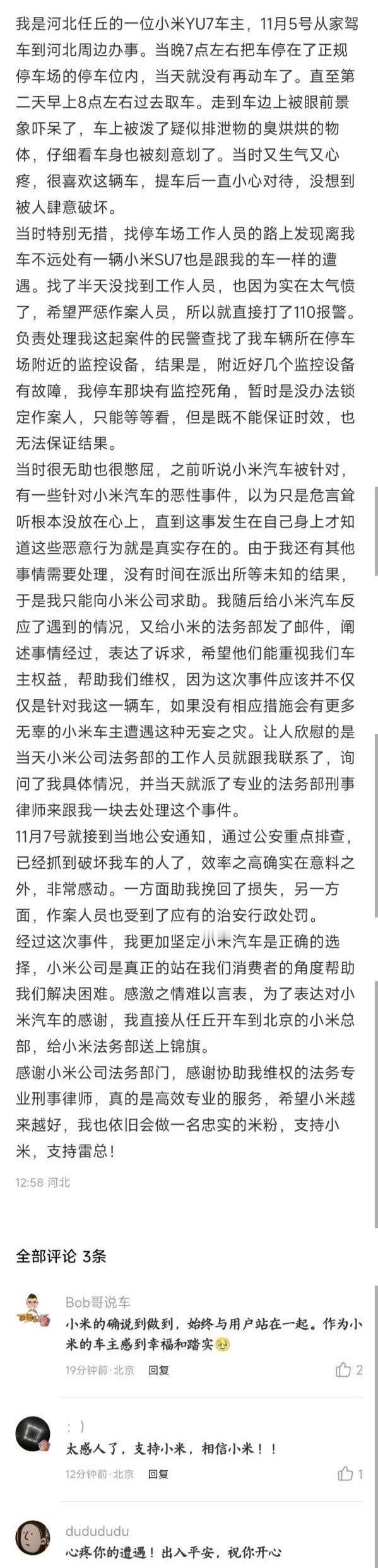 河北任丘小米Yu7车主表示,小米汽车被泼粪,小米法务协助车主及公安抓捕,不远处的一辆Su7也遭遇了泼粪,这次效率很高,很快就抓到了,破坏他人汽车的人。刚开始等未知结果,法务介入后就立刻有结果了,太讽刺了