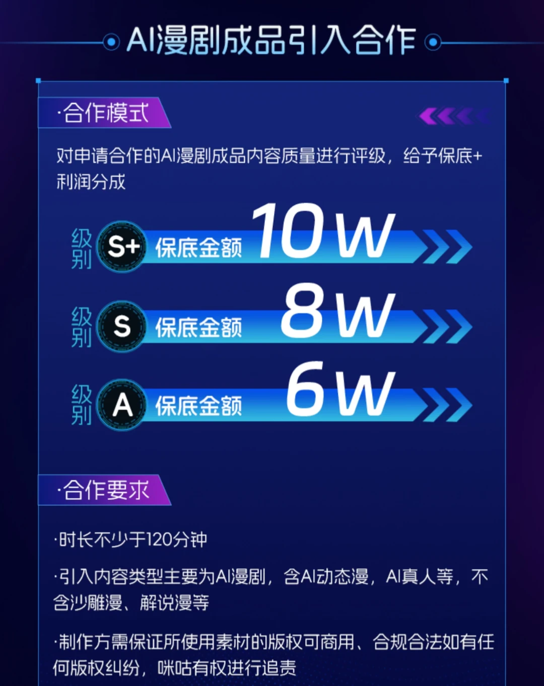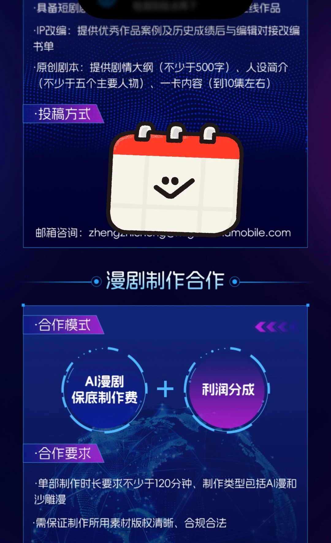 🌟剧本:内容方向 竞技热血、男频脑洞向优先。融合新颖设定与视觉奇观,有分镜表现力与情感共鸣,内容爽感和创新并行,比如热血玄幻科幻、都市创新系统等类型,原创或IP改编均可。 🌟漫剧制作:单部制作时长要求不少于120分钟、制作类型包括AI漫和沙雕漫。需保证制作所用素材版权清晰、合规合法。 🌟AI漫剧成品:时长不少于120分钟。引入内容类型主要为AI漫剧,含AI动态漫,AI真人等,不含沙雕漫、解说漫等。