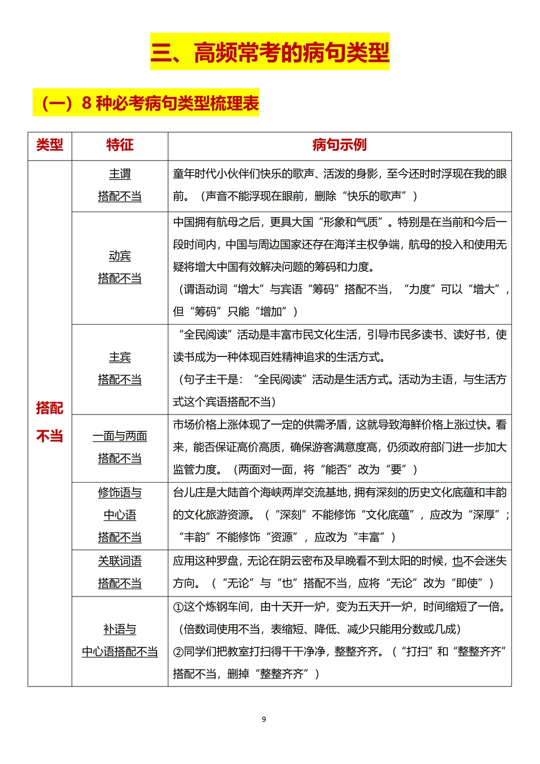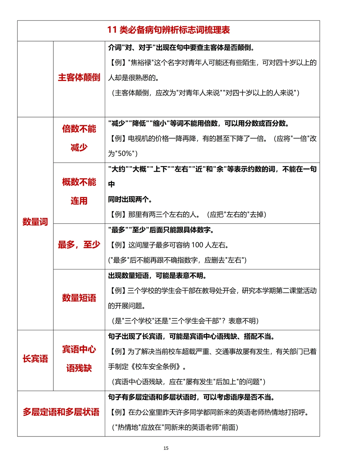 我整理了8种必考病句类型梳理表和11类必备病句辨析标志词梳理表,摸清套路,修改病句就不再困难。
