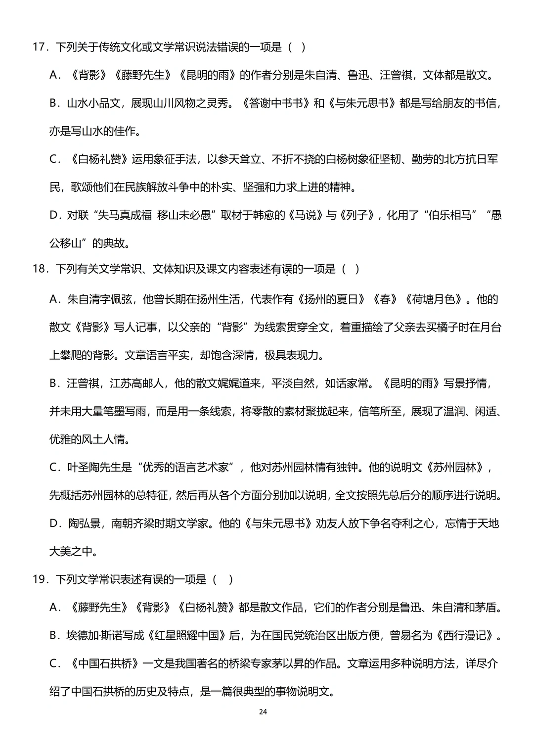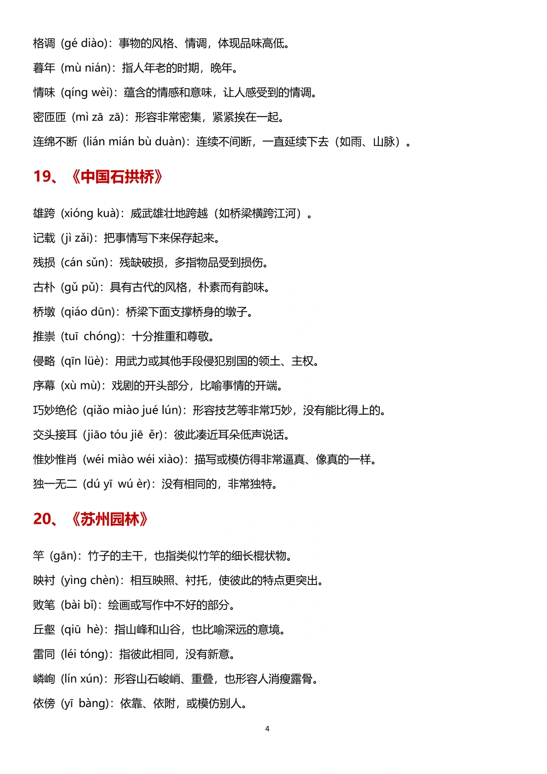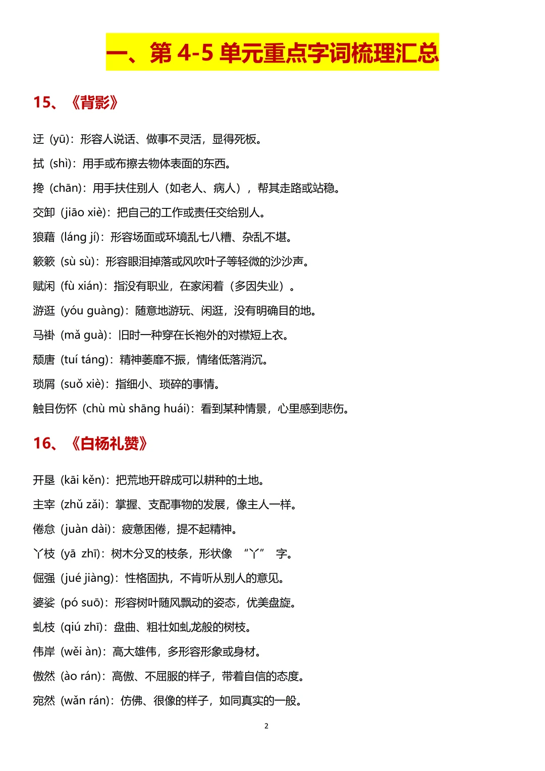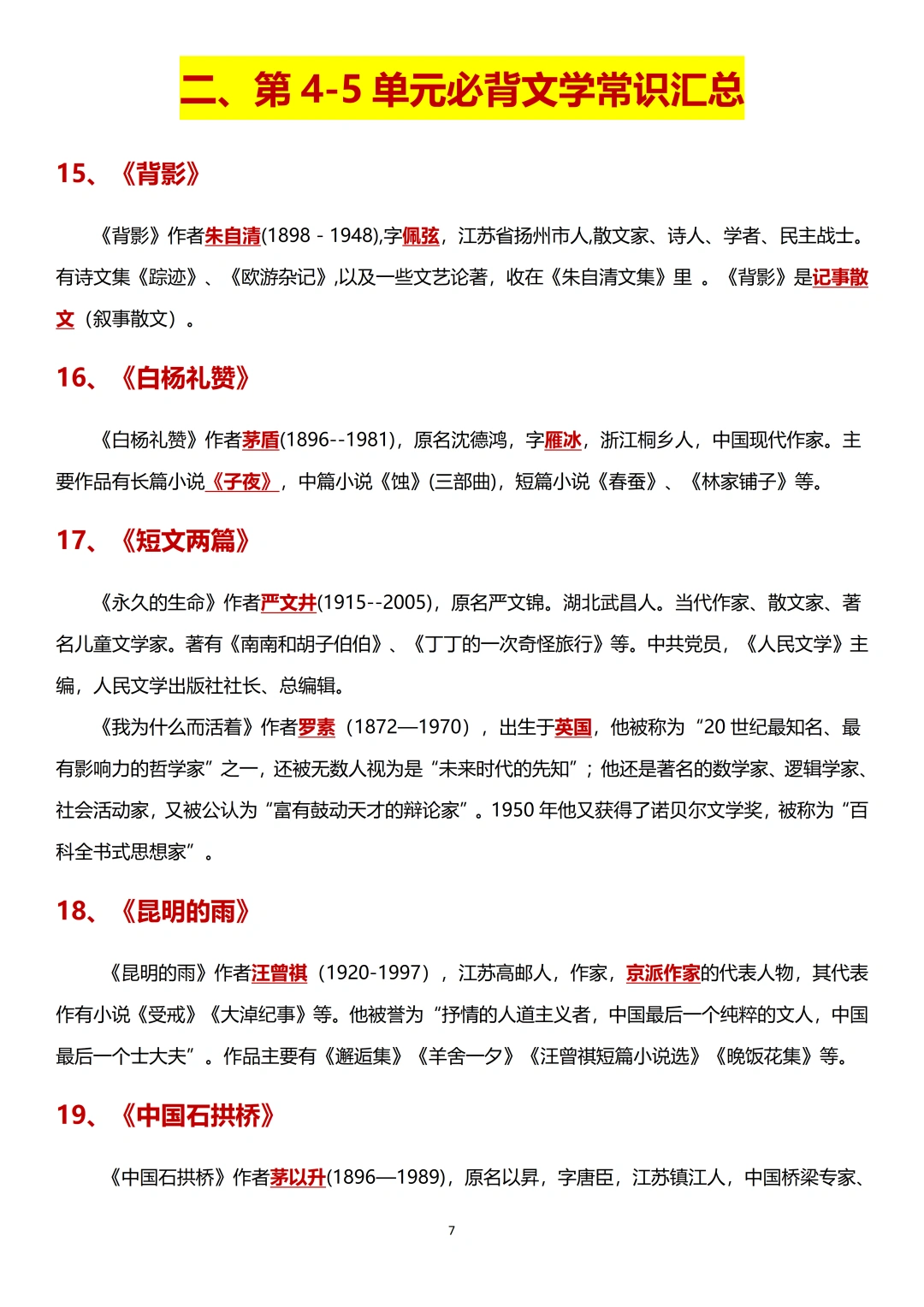 包含第4-5单元每课文学常识,其中《背影》、《中国石拱桥》的文学常识和课文内容是高频考题!例如:朱自清字佩弦,代表作有《扬州的夏日》《春》《荷塘月色》;《中国石拱桥》是一篇很典型的事物说明文。