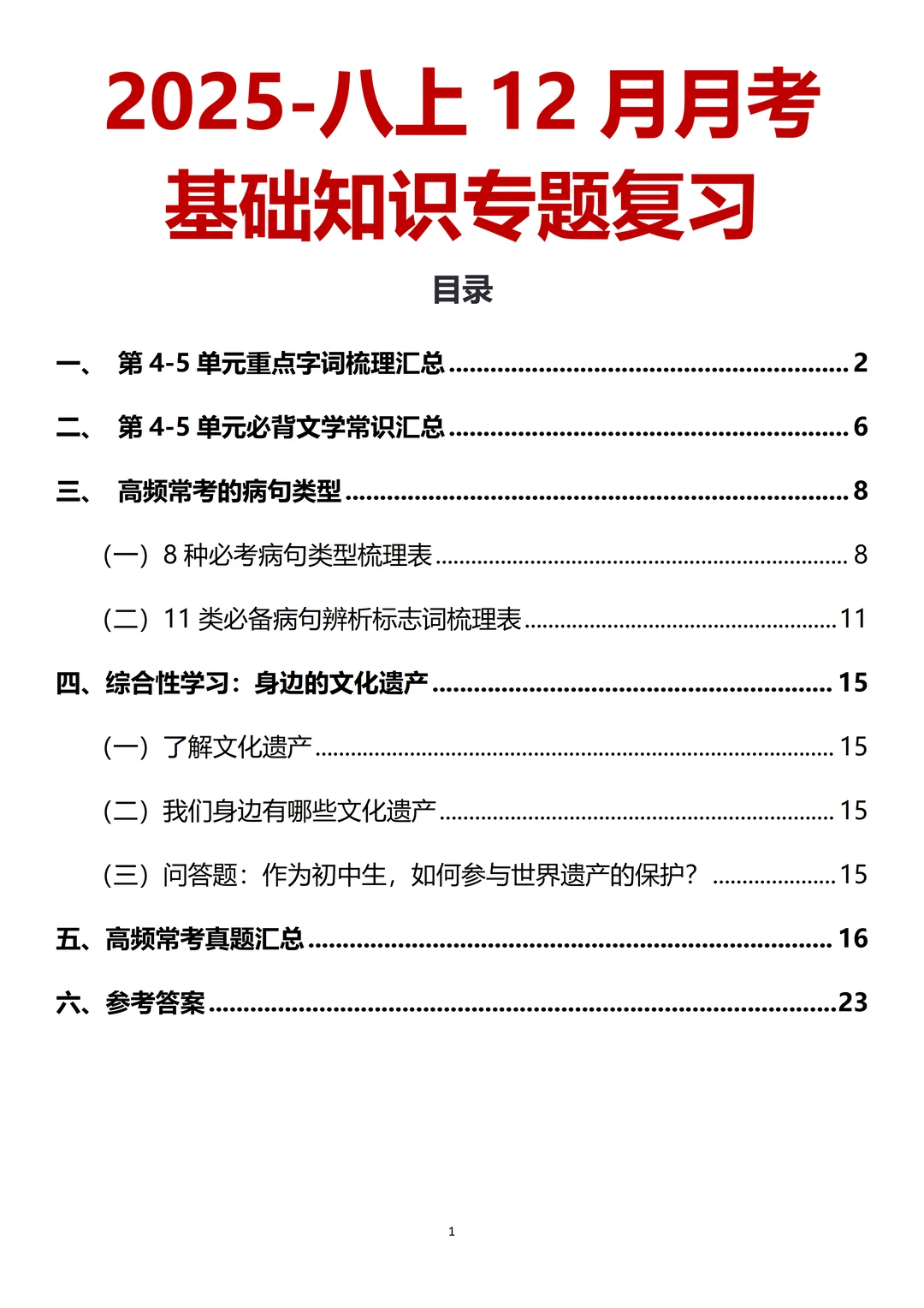 包含基础套题、文学常识题以及综合性学习,都是近 3 年各地12月月考真题,分模块刷题,做完对照答案批改,哪里弱补哪里,效率超高!