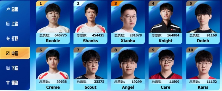 LPL全明星正赛投票中单:IG.Rookie以64万票当选第一 Shanks第二