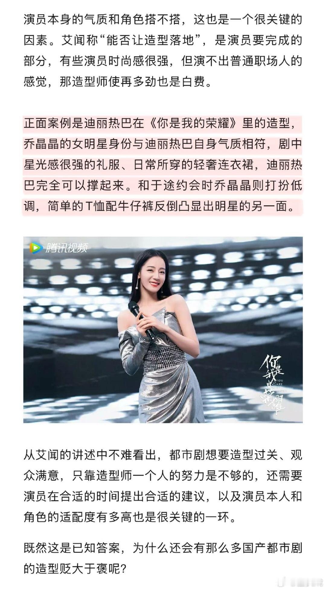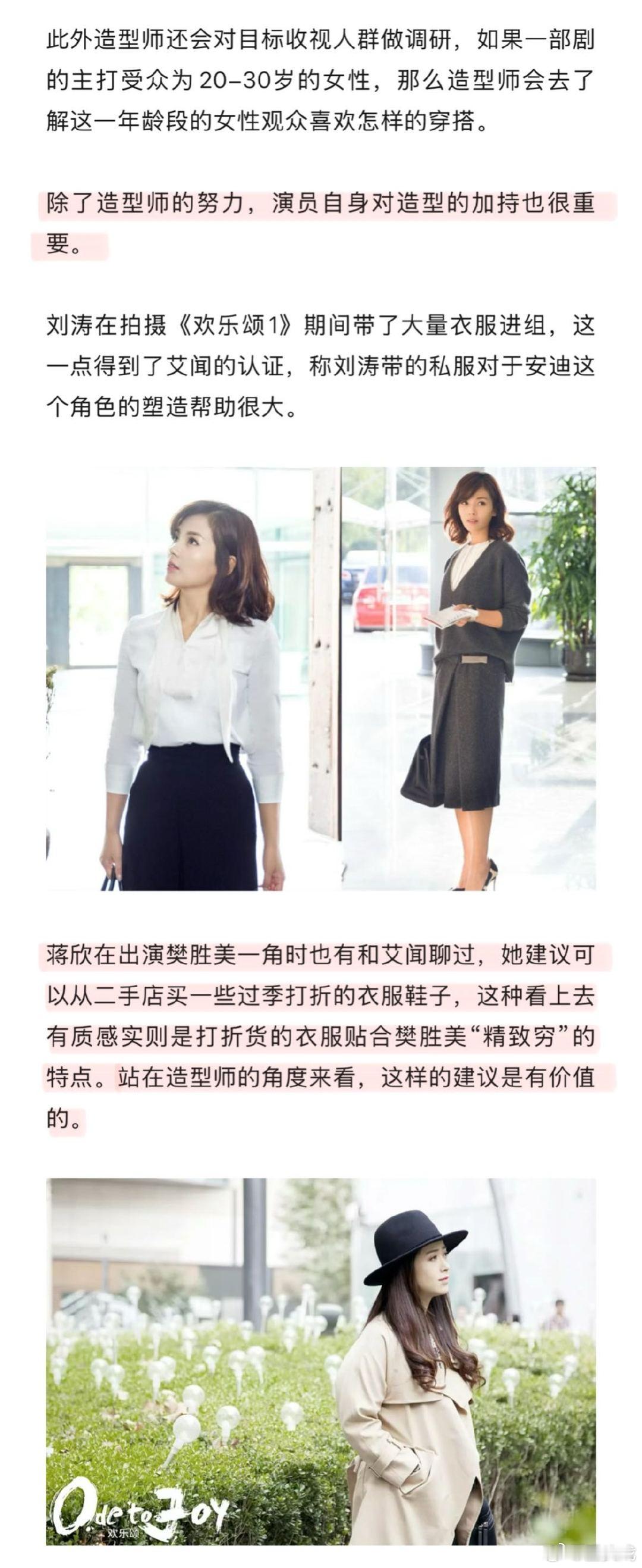 《欢乐颂1》《玫瑰的故事》造型师艾闻采访时称,都市剧造型秘诀藏在细节里,除了调研真实职场穿搭、跟着角色成长调整造型,更离不开演员的默契配合。蒋欣的“精致穷”穿搭建议堪称点睛,迪丽热巴与乔晶晶的气质高度契合。