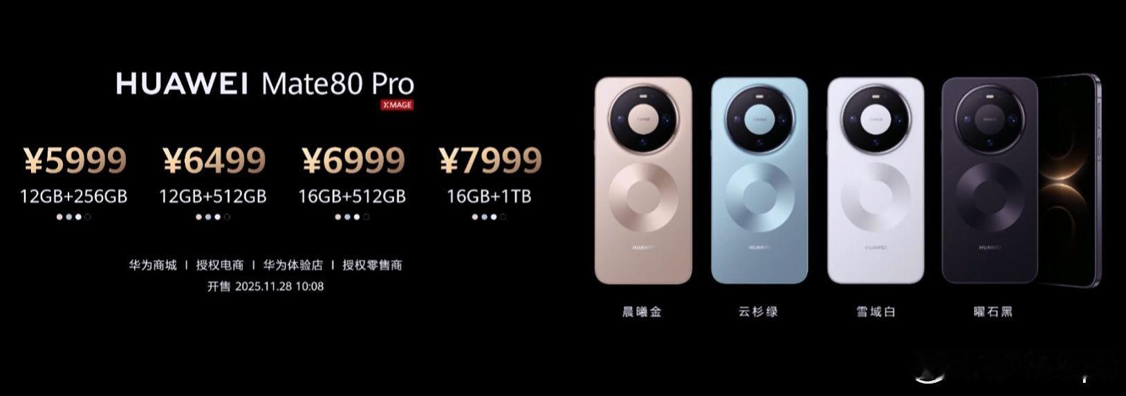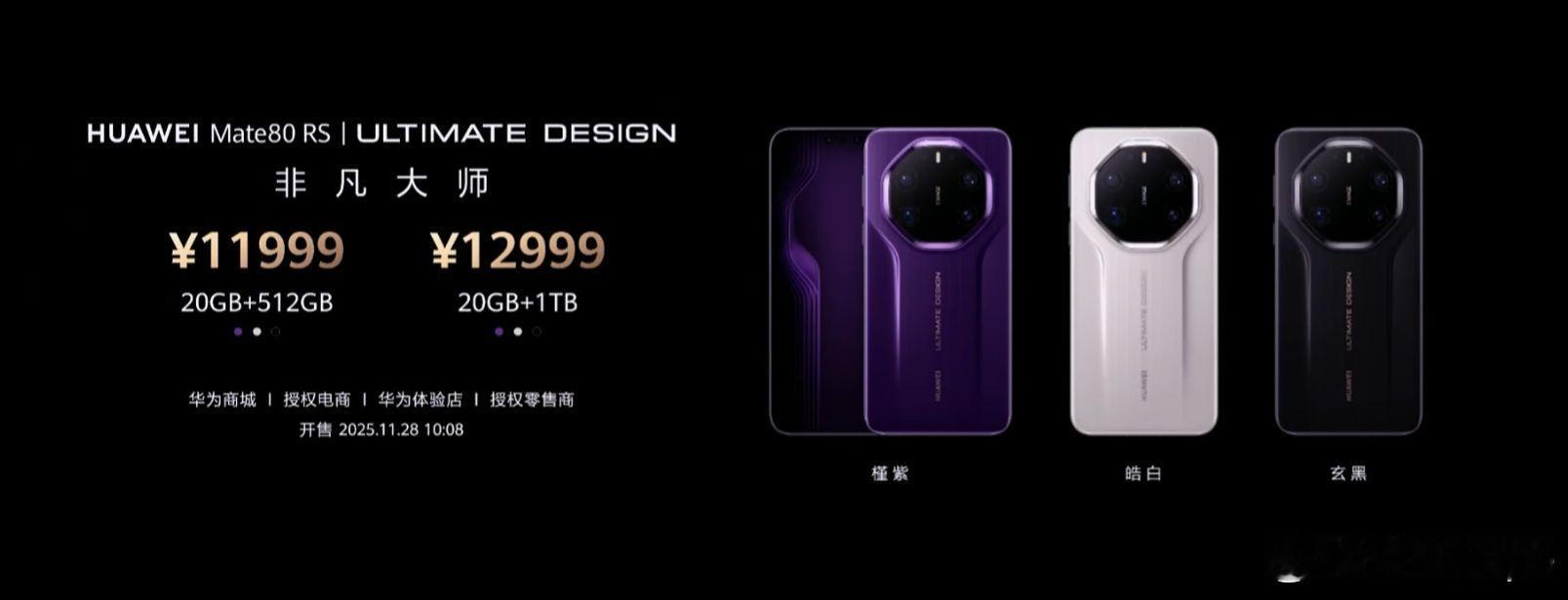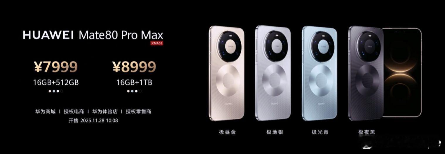 华为 Mate80系列价格来了华为 Mate80 12+256GB 4699 元起华为 Mate80 Pro,12+256GB 5999 元起华为 Mate80 Pro Max,16+512GB 7999 元起华为 Mate80 RS,20+512GB 11999 元起