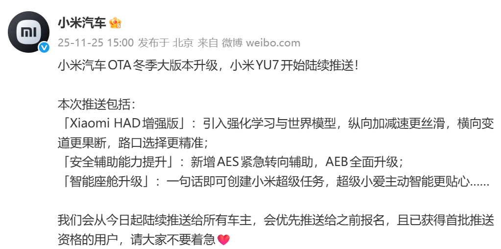 小米汽车今日发文宣布,小米YU7、SU7、SU7Ultra均迎来小米汽车OTA冬季大版本升级,具体版本为XiaomiHyperOS1.11.0,目前已开始陆续推送。
