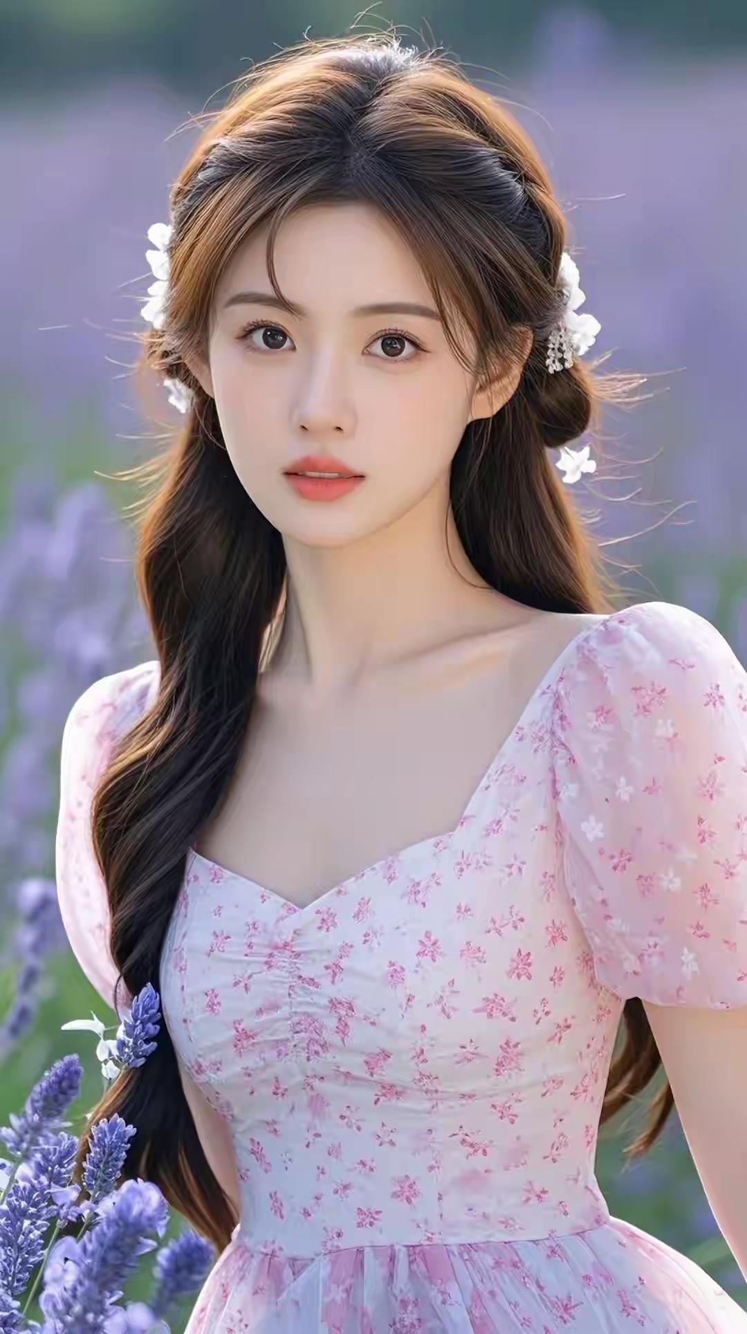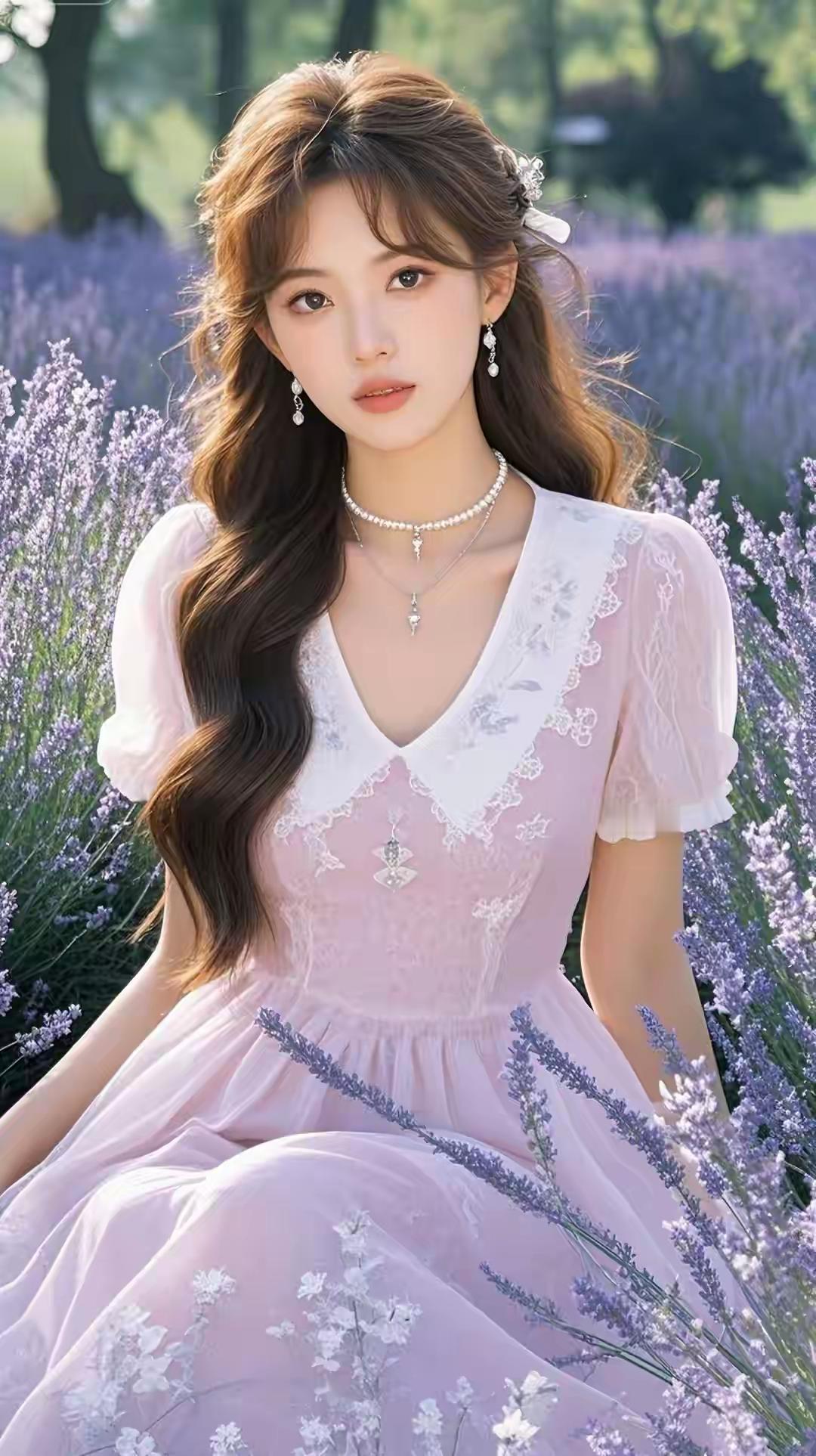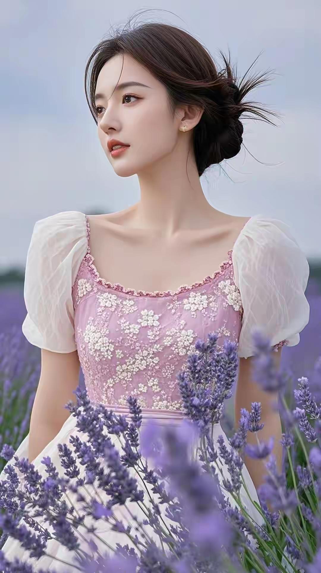 薰衣草田里的粉裙少女,发间碎花白得像落了星光