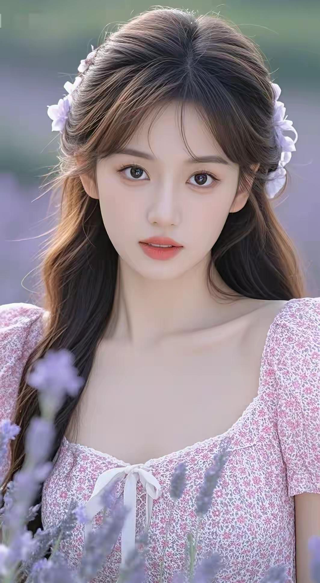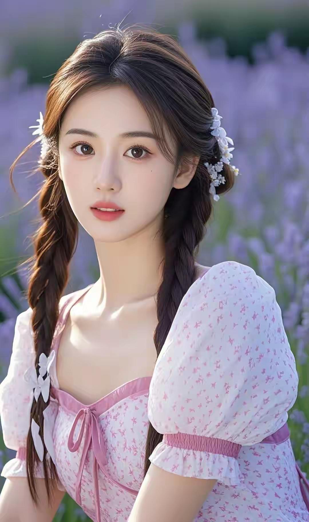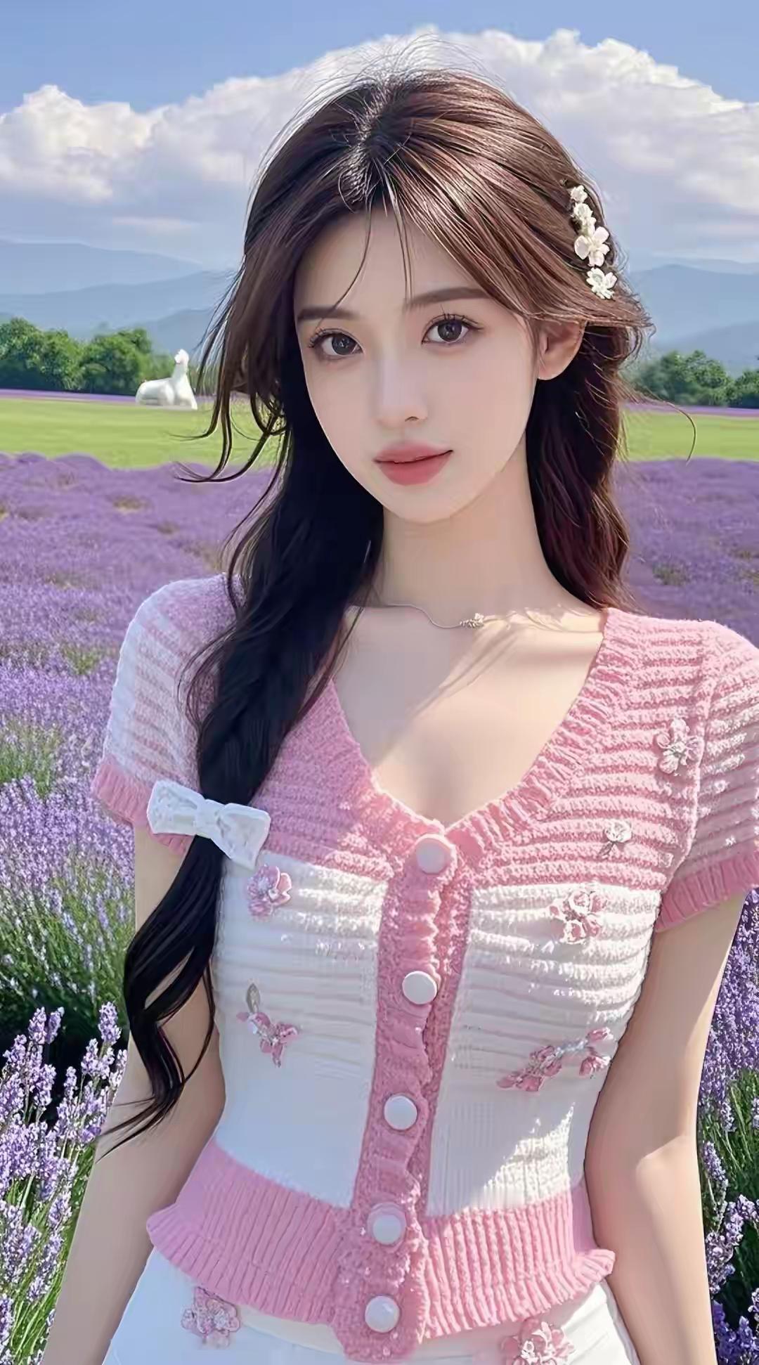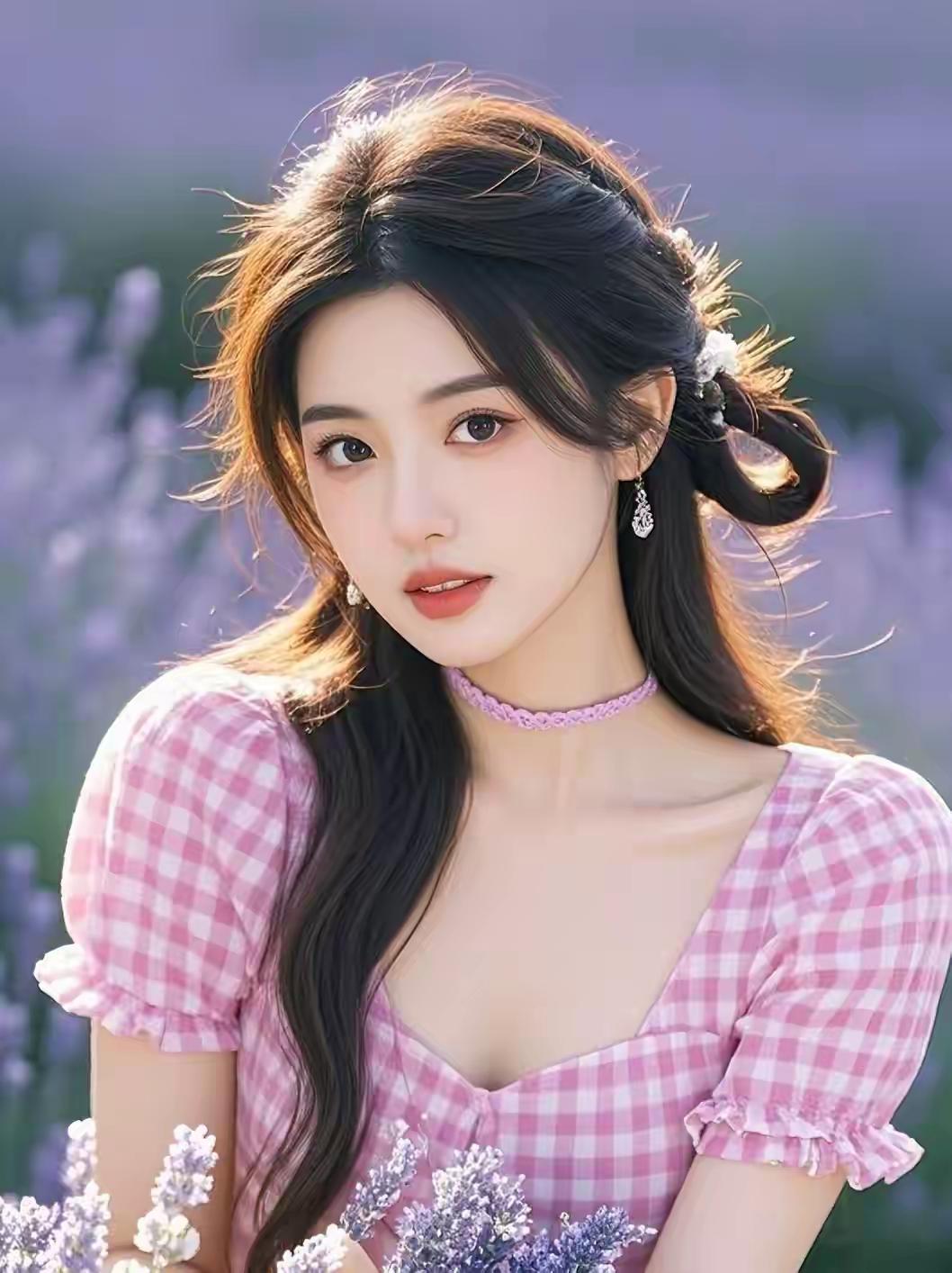 薰衣草田里的粉裙少女,发间碎花白得像落了星光