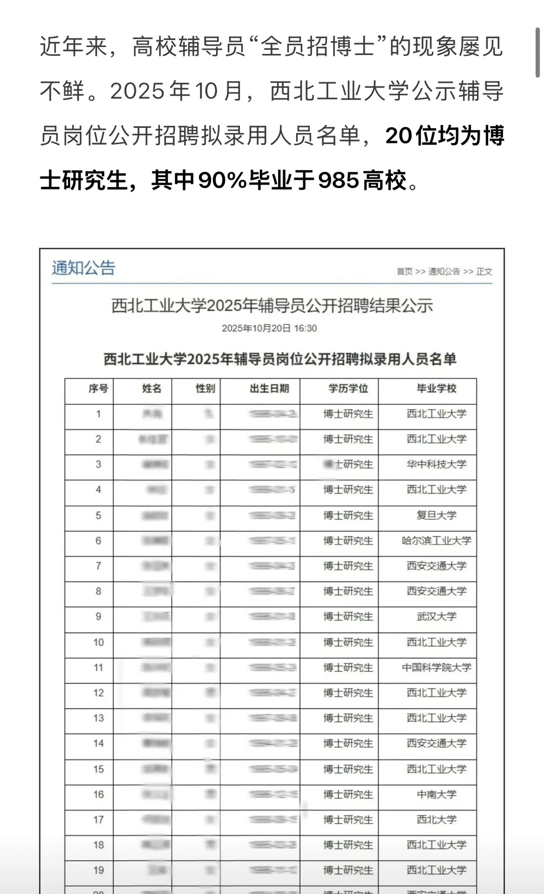 近日,浙江某职业技术学院公示了三批拟聘用人员。其中,辅导员岗位拟聘用人员皆为博士。辅导员全员博士