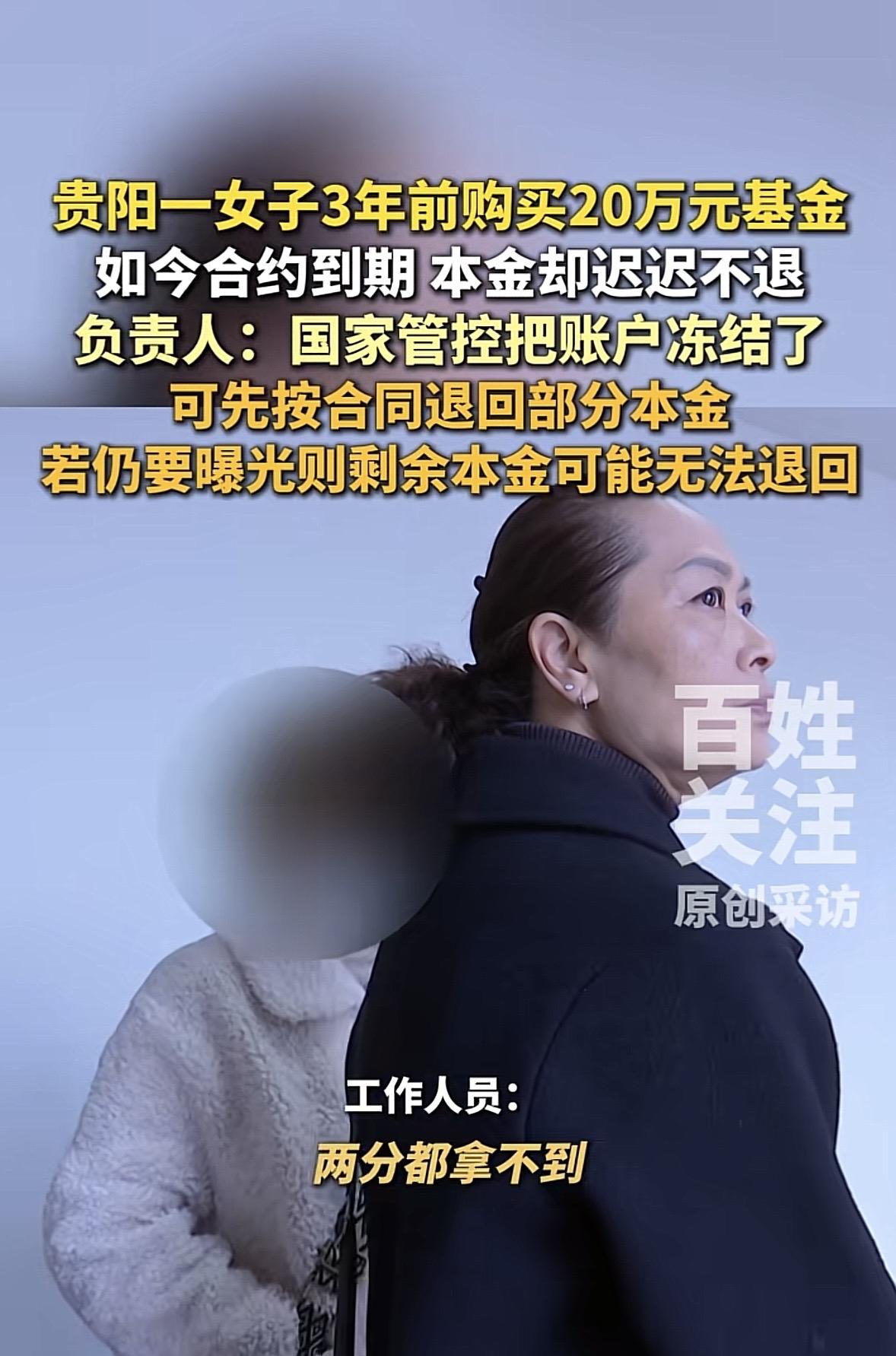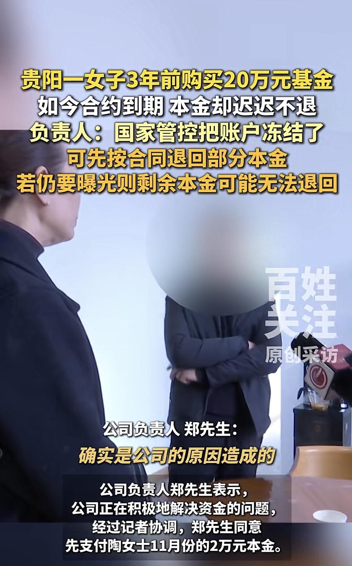 贵州贵阳,女子3年前买了20万基金,每年能拿26000元的收益,本金到期还可以退回,今年9月,合约到期了,对方承诺每个月给她退2万本金,然而,女子迟迟不见到账,她带着记者冲到公司要说法,负责人说公司账户被冻结了,会尽快给女子转账,没想到,另一员工转头就威胁称:敢曝光的话别说2万了,就是2分你都拿不到! 陶女士手里有份投资合同,她眼巴巴瞅着约定的返款日过了又过,账户里却迟迟不见动静,她这心里像被架在火上烤一样煎熬。 3年前,她投进去20万,说好到期连本带息收回,如今第一笔该退的钱就卡了壳。 讨钱路上,她遇上了哭穷的业务员、甩锅的公司老总,还有更让人心凉的员工威胁…… 时间回到2022年,陶女士手头攒了点辛苦钱,琢磨着找个稳妥点的地方放着增值。 在贵阳当地一家公司的推介下,她看中了一款基金产品。 业务员说得天花乱坠,什么年收益能达到13%,投20万进去,一年稳稳当当就能有两万六的利息进账。 最关键的是,合同到期后,这20万本金还能原原本本拿回来。 这听着确实挺诱人,加上对方公司说得信誓旦旦,陶女士动了心,把这笔预备养老的钱投了进去。 盼到今年9月,基金合约总算到期了,本金终于可以回来了,想到这,陶女士心里一块石头落了地。 经过协商,对方公司答应分十期返还她的20万本金,每个月3号固定打2万块到她账上。 陶女士觉得这安排也行,虽然慢点,总归有个盼头。 她特意在手机上设了个备忘录:每月3号,查收2万元。 11月3号,首个还款日到了。陶女士一早睁开眼就摸过手机,银行APP刷了一遍又一遍,可那2万块钱的影子都没见着。 她耐着性子等到下午,又等到第二天,账户还是空空如也。 她的心开始往下沉:怎么回事?说好的钱呢?陶女士坐不住了,赶紧联系当初卖她基金的业务员。 电话接通,没等陶女士开口质问,对方先带着哭腔诉起苦来,说姐,真不是我故意拖着!我自己外面欠了一屁股债,兜里比脸还干净,公司那头也没把钱给我,我拿什么给你啊…… 业务员哭得特别委屈,陶女士听得心里更凉了半截,敢情这钱打水漂了? 业务员指望不上,陶女士直接找到了公司负责人郑先生。这位郑总的说法,跟业务员诉苦的画风截然不同。 他一脸严肃地告诉陶女士:不是公司不想给钱,是政策管控突然收紧,把他们公司的账户都给冻上了,钱在里面动不了。 郑总保证道,现在公司上下正积极地想办法解决资金问题,让陶女士务必耐心再等等。 等?等到猴年马月?陶女士彻底急了,无奈之下求助于媒体。 记者介入后,多方协调下,郑总的态度总算松动了一些,勉强同意先把11月份这拖欠的2万块本金支付给陶女士。 拿到这迟来的第一期退款,陶女士心里却一点也轻松不起来,因为后面还有18万悬着呢! 结果,就在陶女士以为事情稍有转机时,更让她脊背发凉的事儿发生了。 另一位工作人员告诉陶女士和记者,说如果我们给了这2万元,你们还是执意要曝光的话,那别说2万了,到时2分都拿不到,咱们把话说到这! 这话里的威胁意味,是个人都能听出来,言下之意无非就是:想要剩下的钱?那就得乖乖闭嘴! 当天下午,陶女士账户里打进2万元,可她一点也高兴不起来。这钱拿得像是“封口费”,堵心的很。 后面那18万本金,仿佛悬在看不见的钢丝上,摇摇欲坠。 她忍不住想:业务员哭穷是真惨还是演苦情戏?公司账户是真被冻结了,还是压根就没钱填窟窿只想拖延?那赤裸裸的威胁,更是暴露了对方可能根本就没打算老老实实还钱的心思! 这家公司和它的基金产品,背后到底藏着多少见不得光的东西?陶女士只觉得一股寒意从脚底板往上冒,这讨债路,怕是不好走。 那么,从法律角度,怎么看待这件事? 《民法典》第577条规定:当事人一方不履行合同义务或者履行合同义务不符合约定的,应当承担继续履行、采取补救措施或者赔偿损失等违约责任。 简陶女士与基金公司明确约定“每月3日退还2万元本金”,构成分期履行债务的合同关系。 公司没有按约定在11月3号支付首期2万元,已构成违约。 根据规定,公司需要承担继续履行,包括支付到期及未到期本金,及赔偿损失,如利息损失等责任。 公司以“冻结账户”为由拖延还款,需承担举证责任。如果无法证明账户冻结系不可抗力或政策调整导致,则不能免除违约责任。 针对陶女士的遭遇,这边也提醒大家,年化13%远高于市场常见稳健理财收益,本身就暗藏高风险。面对过高收益承诺,一定要多方核实公司资质和产品详情,警惕“画饼”。 对此,你怎么看? 关注@运良说法. 学法律知识不迷路