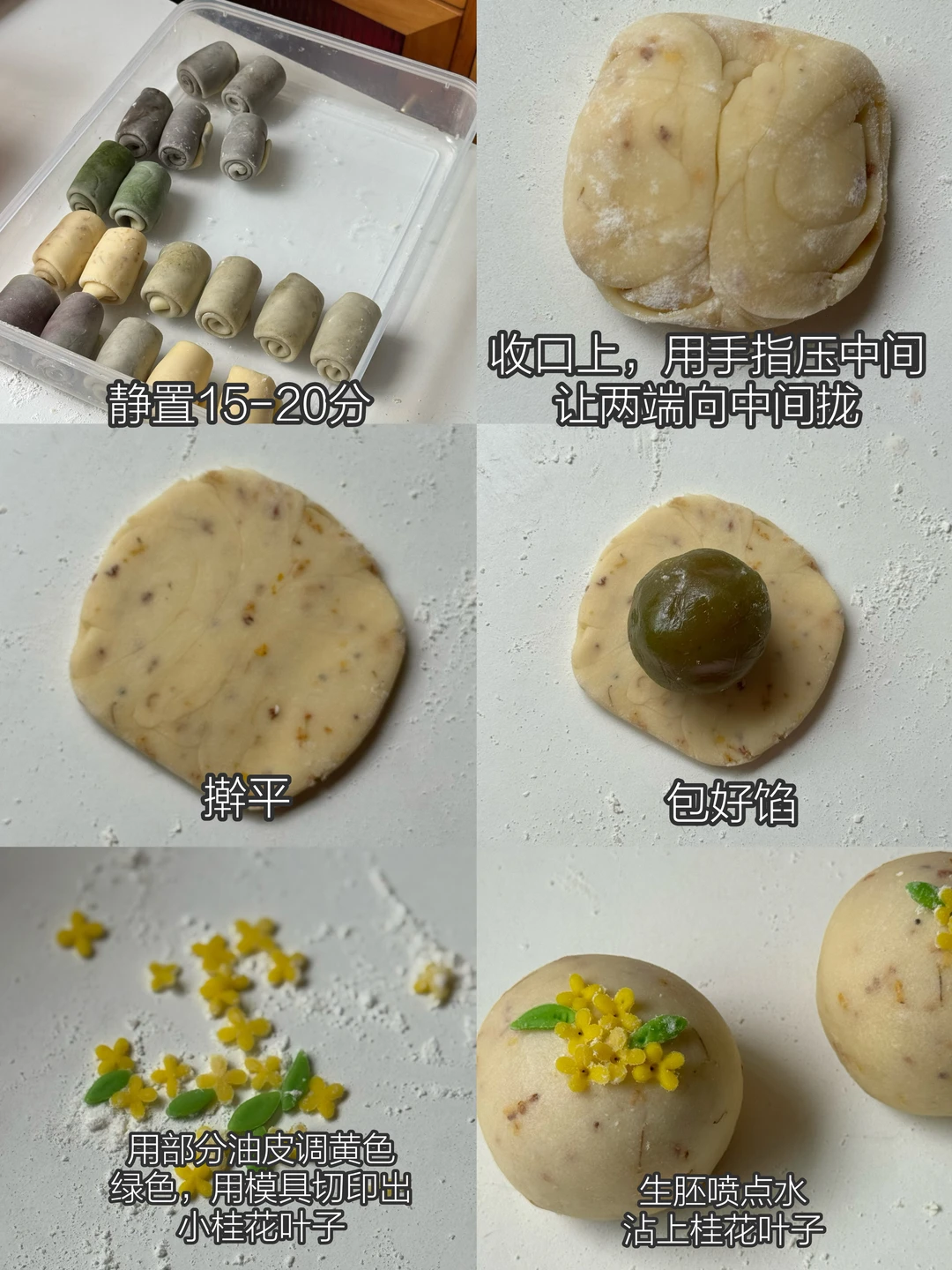 🌿二擀,收口向上,擀成长牛舌状卷起静置15分手指压中间使两端向中间靠拢,再把面团擀圆擀平。包好馅,后面用虎口收口,收口他下。贴上提前备好的桂花小叶子。