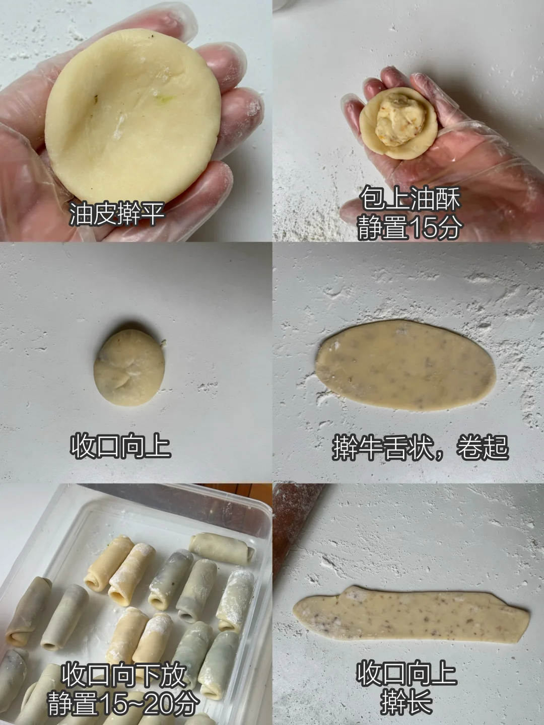 🌿油皮包油酥,收口向下静置。一擀,收口向上擀成牛舌状卷起,收口向下静置15分