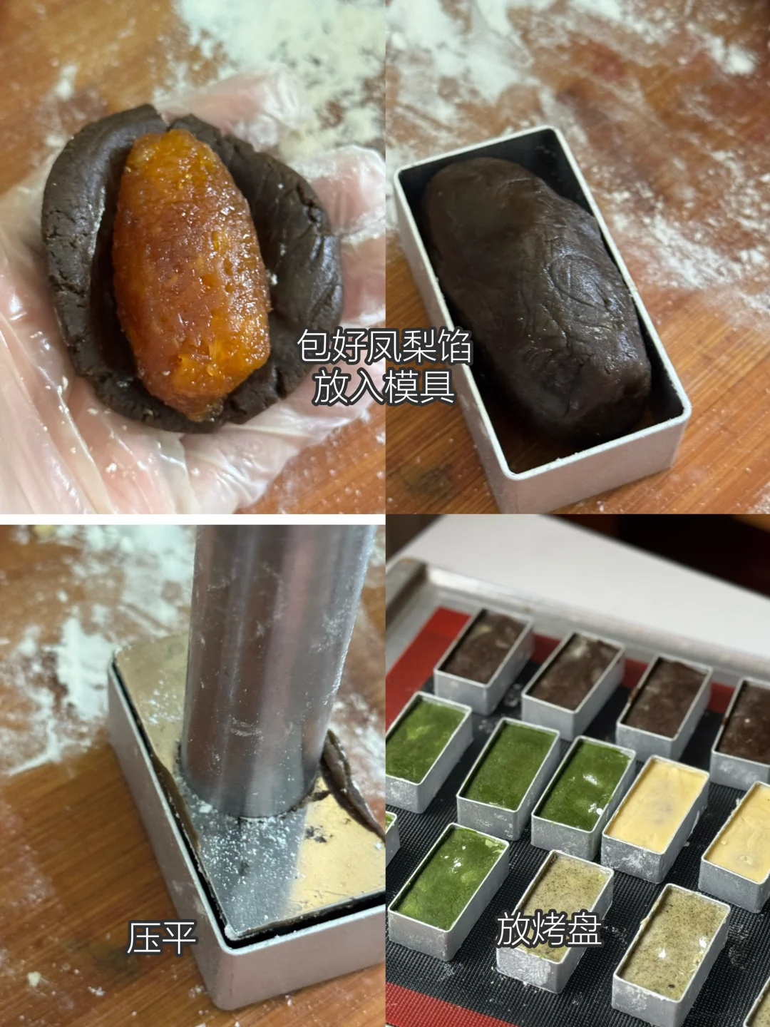 吃了甜食会开心 焙茶大爆!!它是真好吃!!低咖啡因,带点焦香,一边烤一边流口水,焦香,吃了不怕睡不着! 材料:黄油150克,全蛋液26克,低粉250克,糖粉70克,焙茶粉10克 ✔️黄油软化,加入蛋液搅均匀(乳化),加入粉类搅至无干粉(厨师机做法) ✔️酥皮面团25克/份,凤梨馅25克份 ,酥皮压平包上馅,包好放入模具压平后放上烤盘,放上一层烤垫,再压一个烤盘,风炉145度,先烤20分,翻面再烤10分 ✔️出炉放凉打包即可。