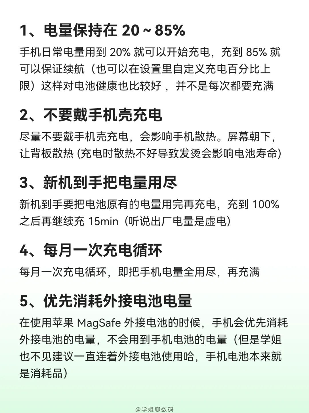 🔋 学姐总结了能够延长iPhone电池寿命的几个小技巧,这些你都知道吗? [一R] 电量保持在20%~85% [二R] 尽量不要戴手机壳充电 [三R] 新机到手把电池电量用尽再充电 [四R] 每月一次循环充放电 [五R] 使用MagSafe等外接电池会优先消耗外接电池电量 有几个也是学姐近期才发现的,快🐴住!