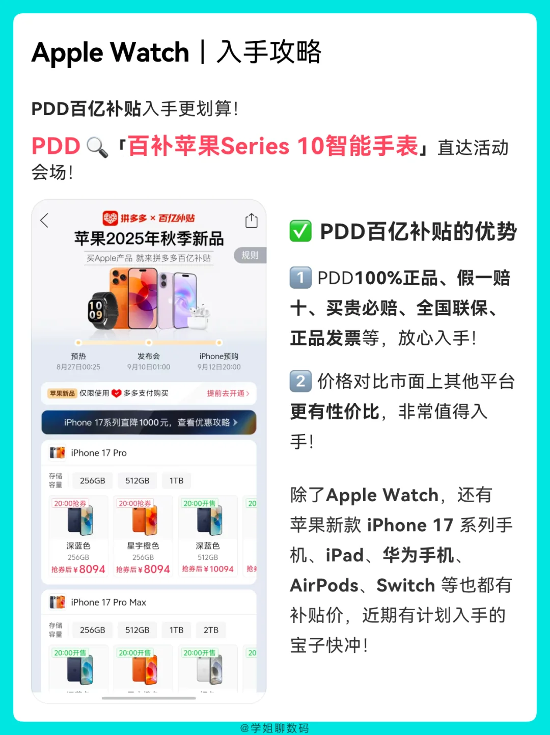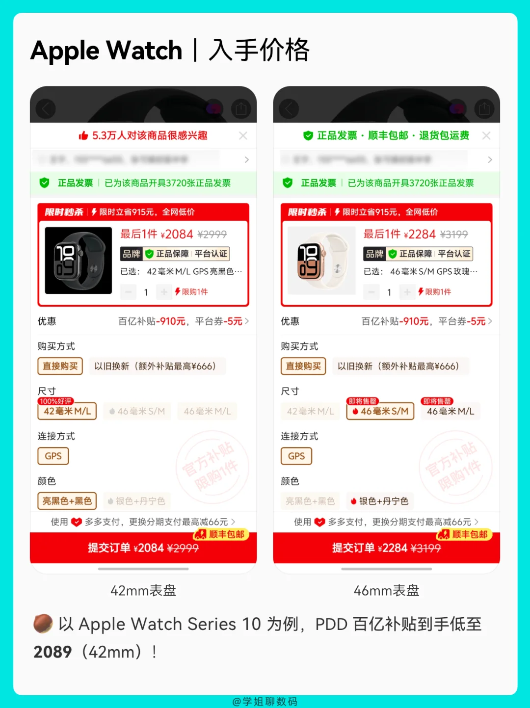 目前PDD百亿补贴入手更划算!享受官方补贴优惠,PDD 🔍「百补苹果Series 10智能手表」直达活动会场!100%正品,支持国行联保、支持正品发票、支持假一赔十、支持买贵必赔!价格对比其他平台更有性价比,非常值得入手!