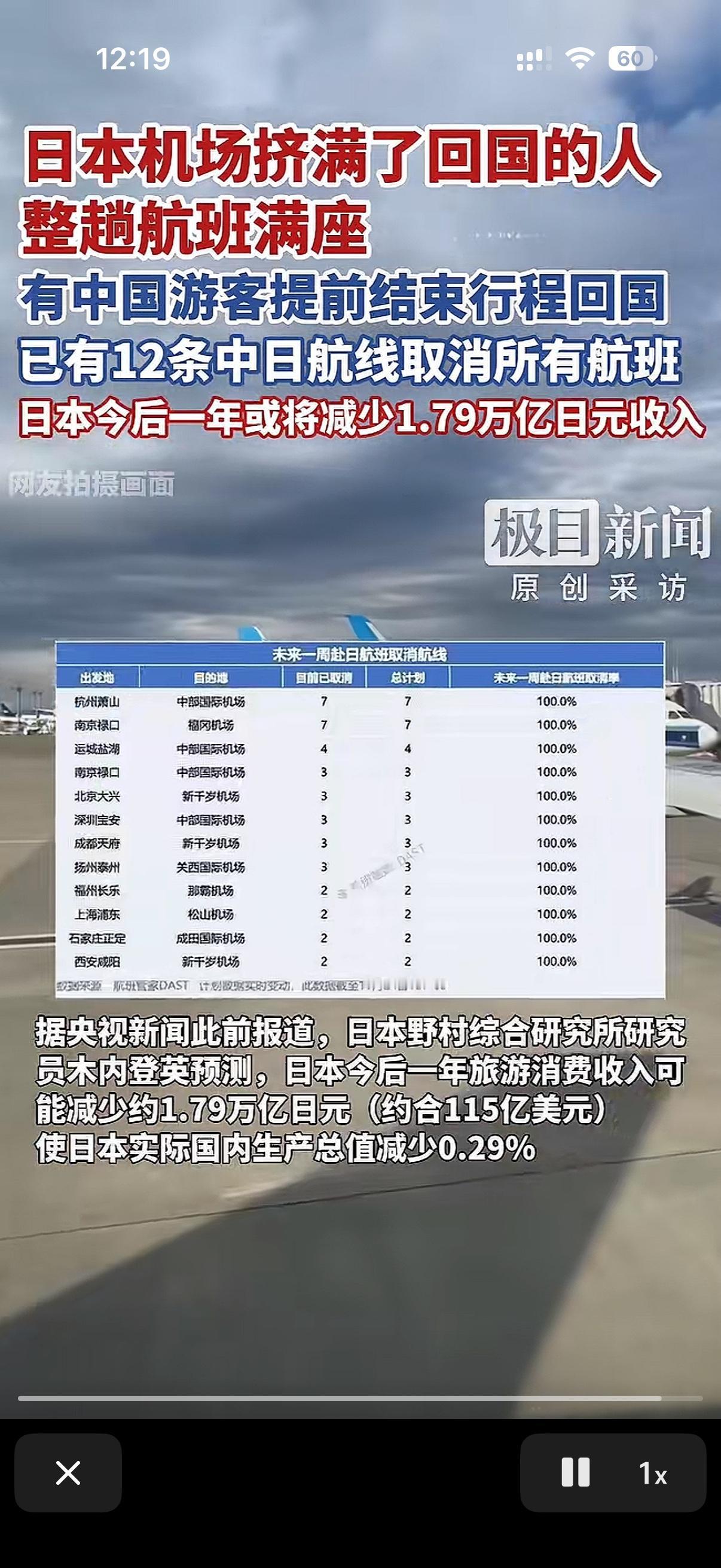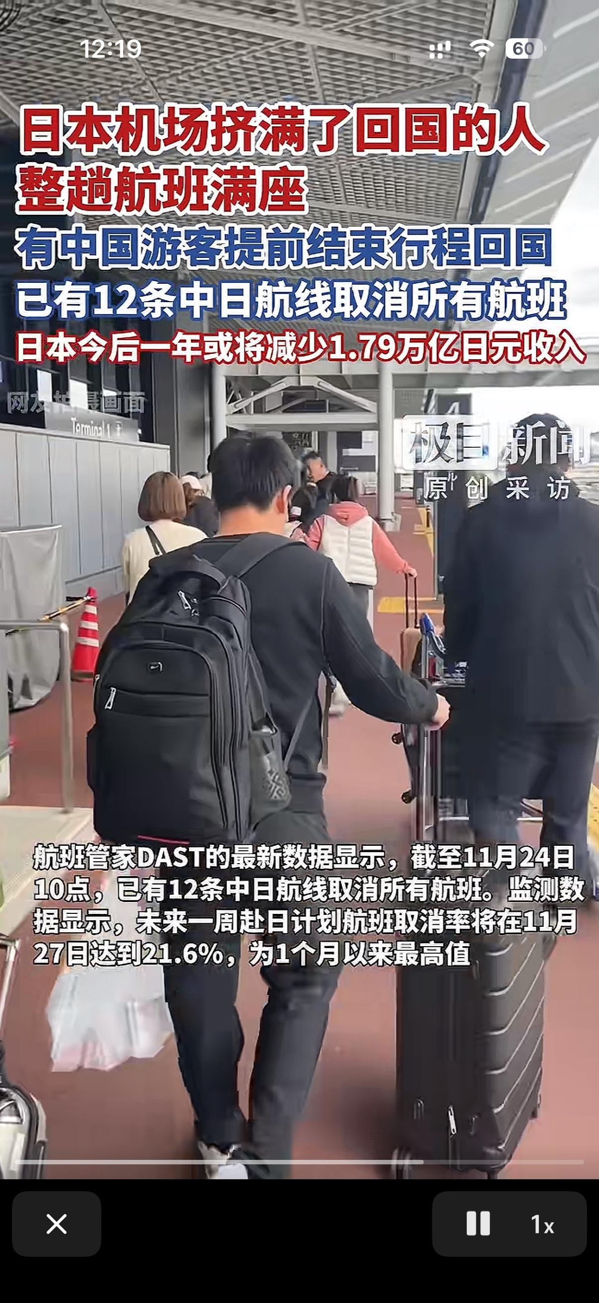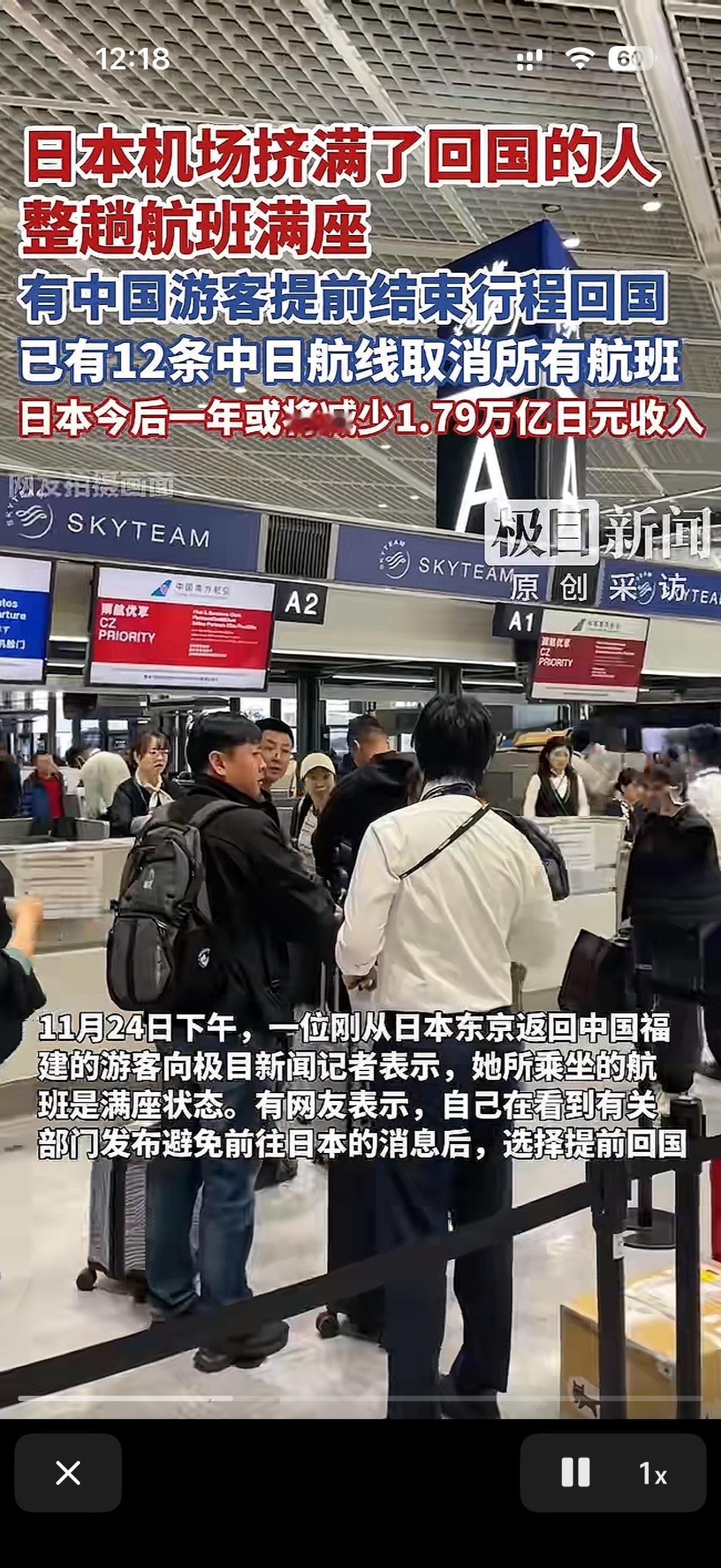 在日本的机场里想回家的中国人人满为患。众所周知,因为最近日本女首相高市早苗的不当言论,中日关系十分紧张。 在日本已经有一些右翼分子在针对性的伤害中国公民。 国家也早就提醒过这段时间不要去日本旅游,很多国内航空公司也早就开通了无责退票功能。不少人早就取消了去日本旅的行程,但是还有不少中国公民在日本旅游和工作,随着最近局势紧张,不少人都选择回国,但是飞往中国的航班毕竟有限,现在每架航班都会坐满回国的人。 中方对日本态度 中方对日本态度