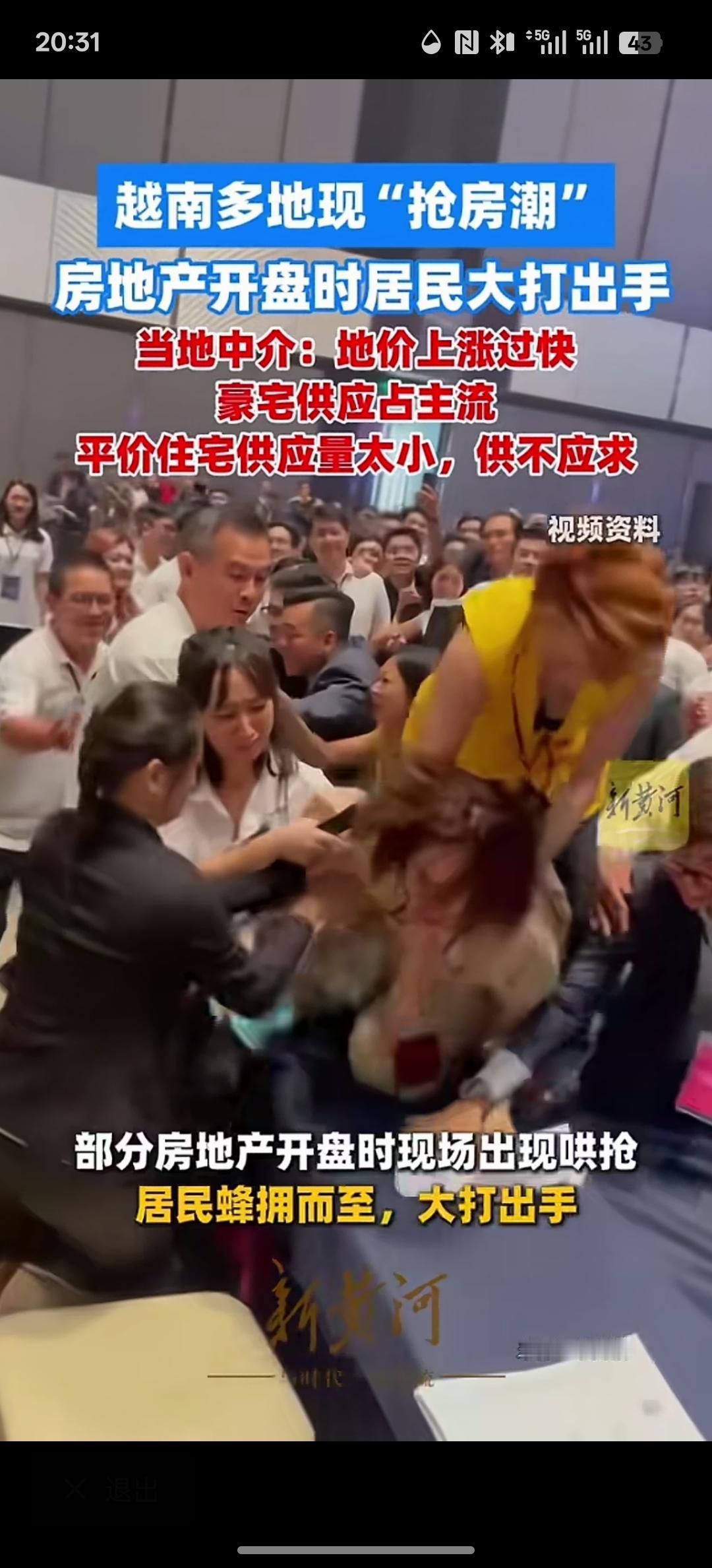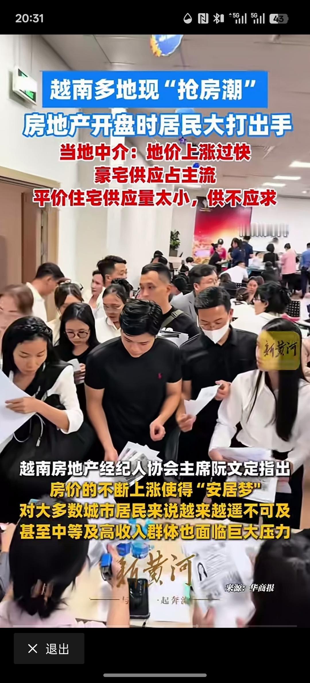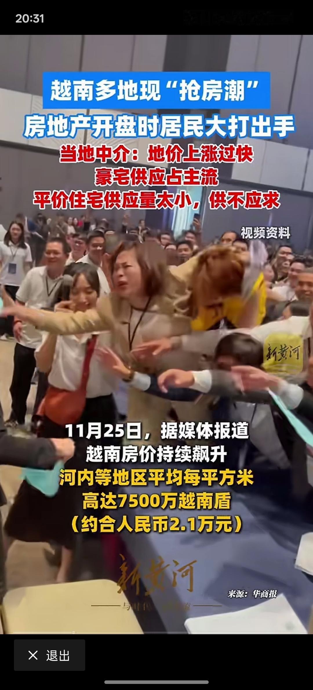 越南房价大幅上涨,现在越南多地出现了抢房潮,每平米上涨的价格折合人民币约2.1万一平米,房价涨的过快,地价也是猛涨,房价炒高,然后工资必须涨,按照这种资本推高房价,出口没有竞争力了,然后一地鸡毛,如果持续这样扩张,越南经济会因为房地产短时间的冲高,就怕是虚高,最后导致房地产爆雷,一地鸡毛!