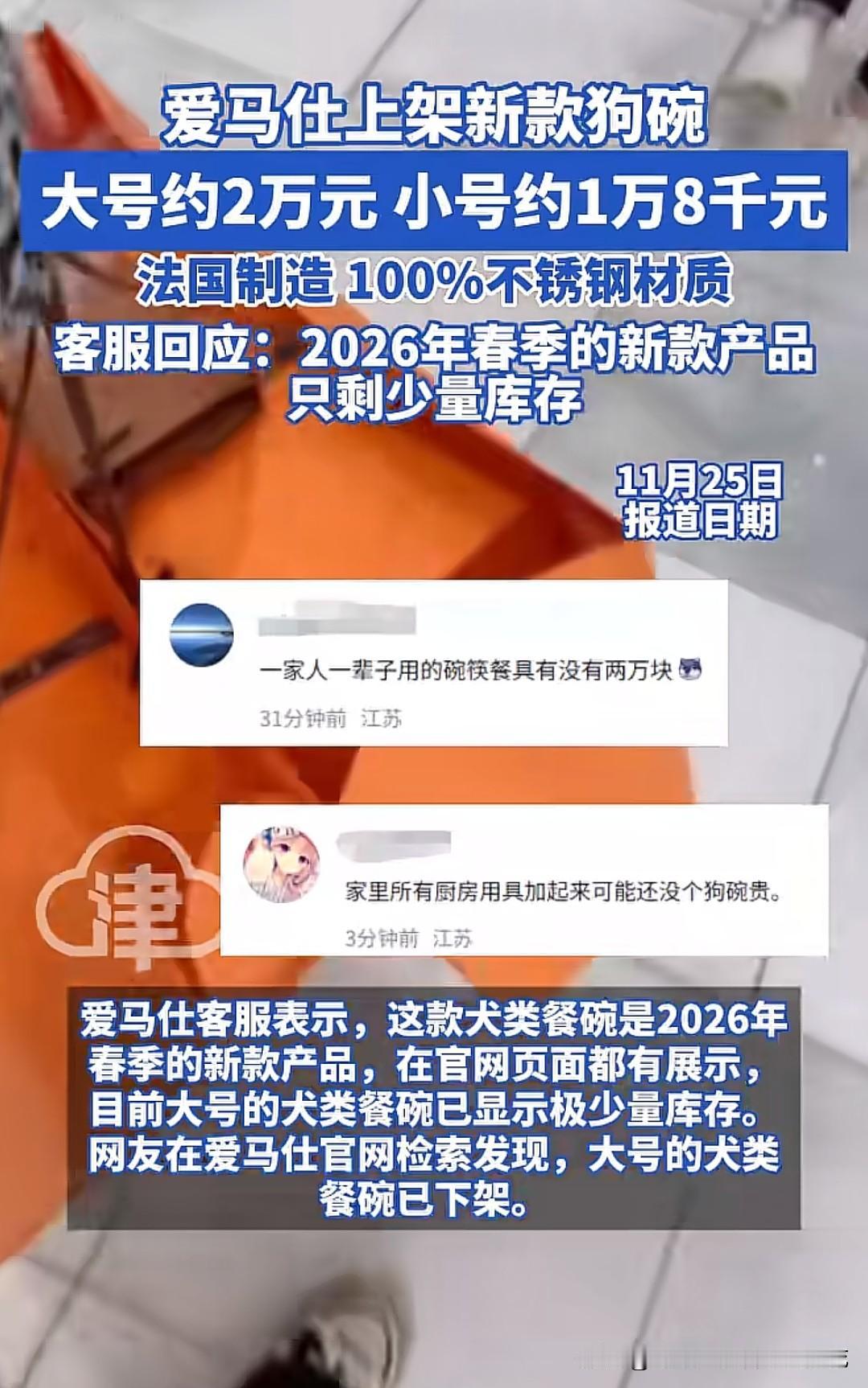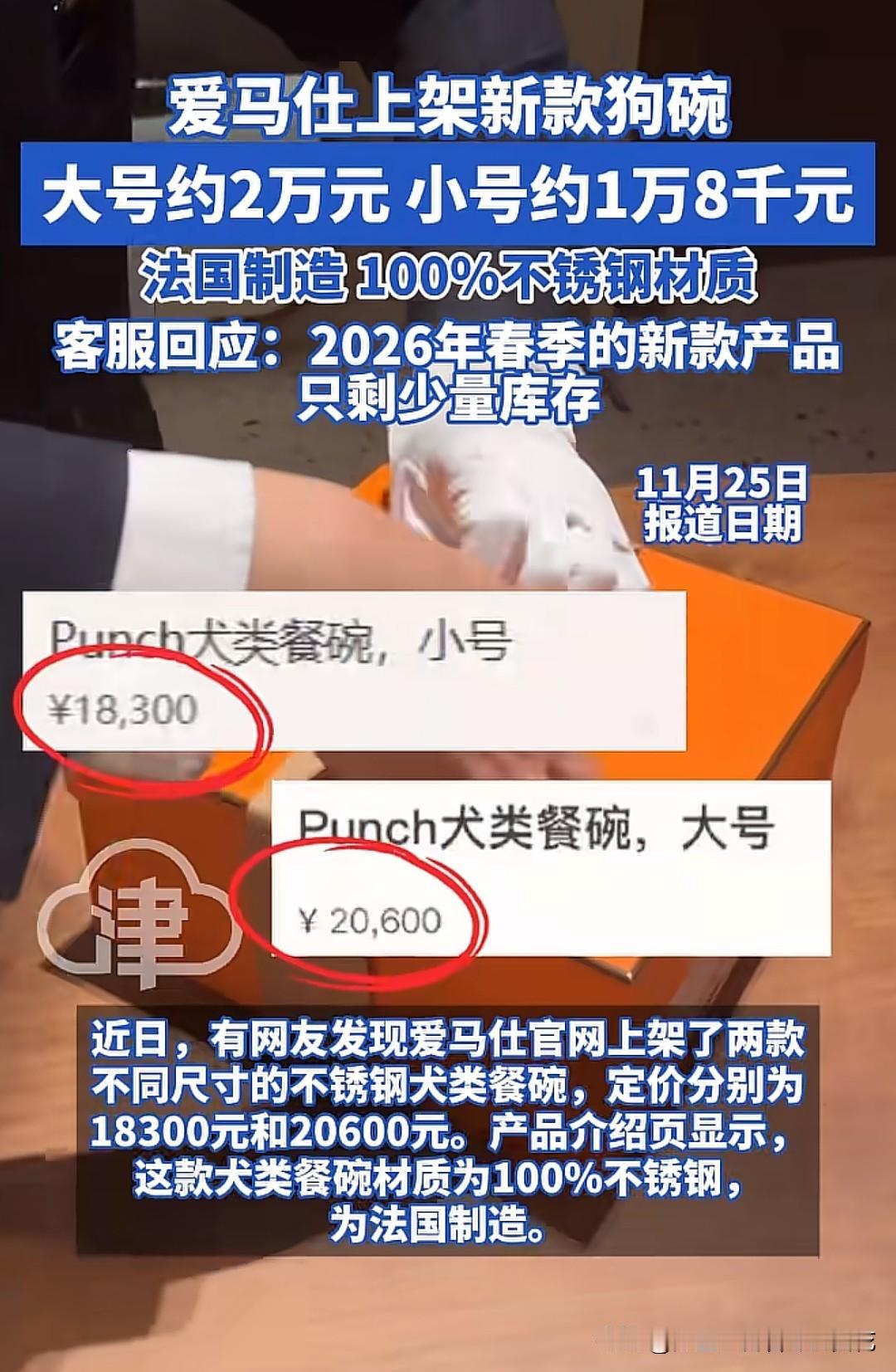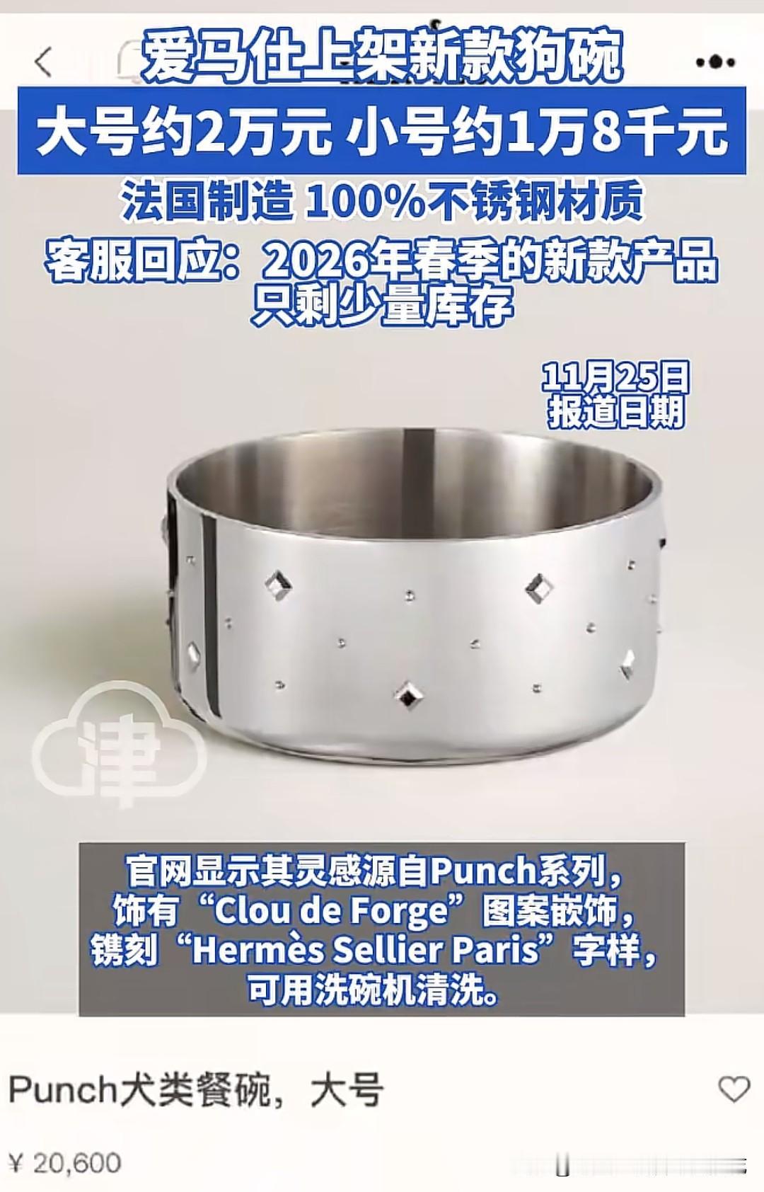 想不到爱马仕也卖狗碗了,售价高达两万多,很多网友直言这个是给人傻钱多的人准备的。虽然话糙理不糙,但这么贵的狗碗,不坑穷人,也不坑不养宠物的人,只迎合那些爱给宠物高消费的一拨人,比如狗吃的用的,花钱如流水,她们要的是情绪价值,要的是消费带来的愉悦感和新鲜感。 这样一说大家就很好理解爱马仕为什么会出这么精贵的狗碗了,买的人不会太多,但一定会有人买,况且狗碗只要不被偷,就可以一直传下去,几百年后,几千年后,依然跟新的一样。所以舍得买的人,并不会因为它只是狗碗,重要的是它可以被重视,被关注,可以向外人展现自己的经济实力,以及那种对宠物全盘托出的爱。