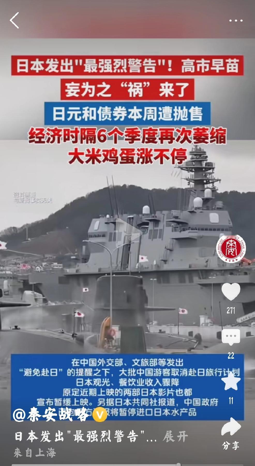 持续不断的消耗日本 个人观点:既然日本一如既往的颠倒黑白,倒打一耙,顽固狡辩。那么,中国只好继续反制,持续不断的消耗日本军事潜力。 当下的反制手段越多,力度越强,深度越广。那么未来我们的子弟兵就会减少伤亡。所以个人认为:我们的子弟兵,每一个都是爹养娘生的孩子,举世无双。 反制手段越来越多,力度越来越强,深度越来越广,是一件对国,对家,对民的大好事,鼎力支持。