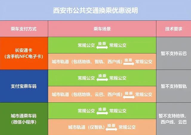 乘客不需要改变原有的支付方式,即可根据换乘情况选择相应的支付方式实现优惠。有以下几点需要说明:(1)换乘前后需使用同一种支付方式;(2)长安通卡是指普通成人长安通实体卡(含NFC电子卡),享受换乘优惠政策(学生卡、老年卡、爱心卡等其他优惠卡种已经享受更加优惠的乘车政策,因此不再参与换乘优惠);(3)符合条件的二维码是指可同时支持西安市常规公交与城市轨道出行且参与优惠政策的App或小程序(例如支付宝、微信等),根据符合条件情况,将适时动态调整。