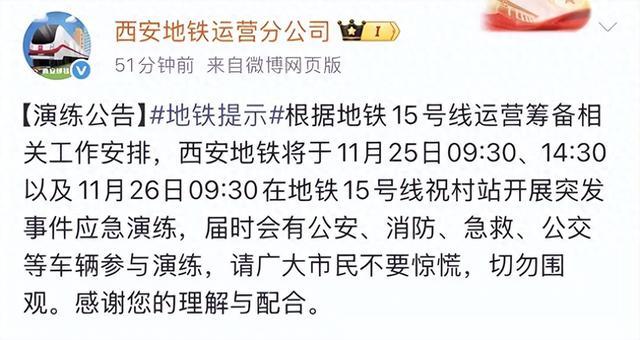 根据地铁15号线运营筹备相关工作安排,西安地铁将于11月25日09:30、14:30以及11月26日09:30在地铁15号线祝村站开展突发事件应急演练,届时会有公安、消防、急救、公交等车辆参与演练,请广大市民不要惊慌,切勿围观。感谢您的理解与配合。
