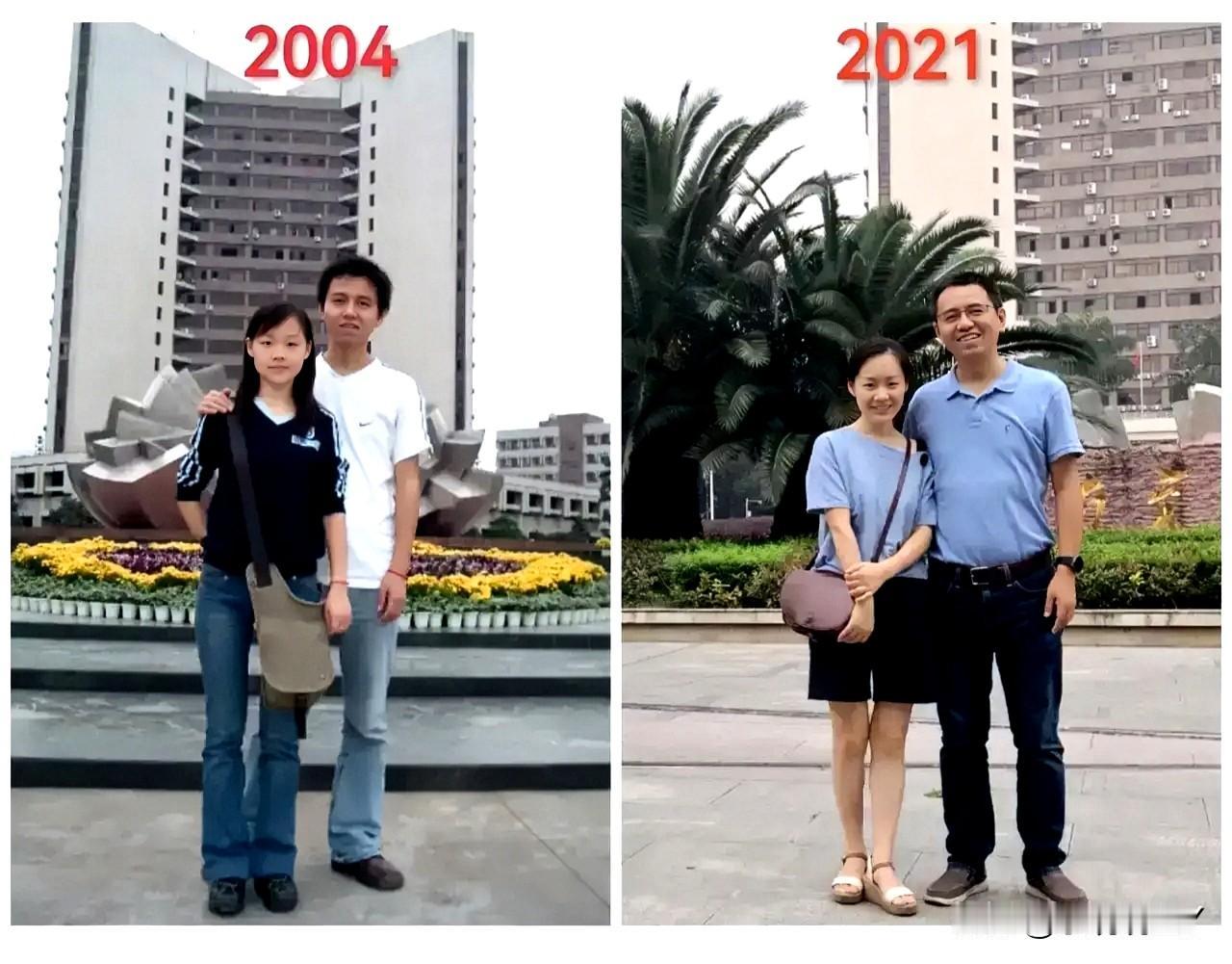 这是17年前和17年后,夫妻二人在学校同一地方的合影。如今妻子魅力不减,丈夫成熟