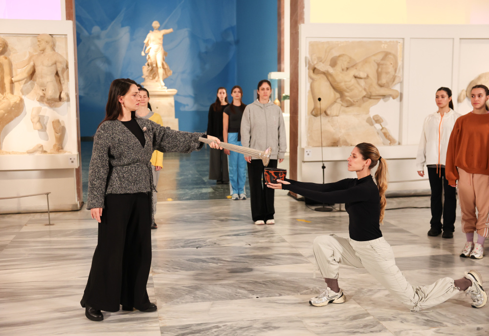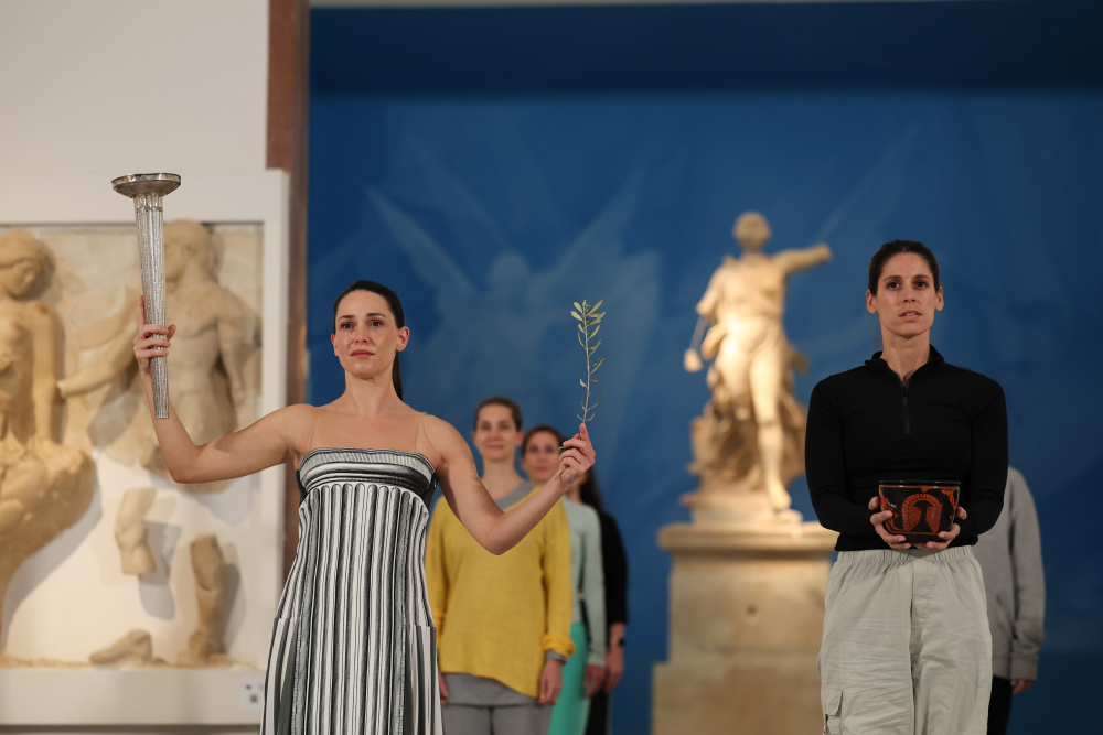 11月25日,扮演最高女祭司的演员玛丽·米娜(右)与第一棒火炬手、希腊运动员彼得罗斯在彩排中。新华社记者李京摄