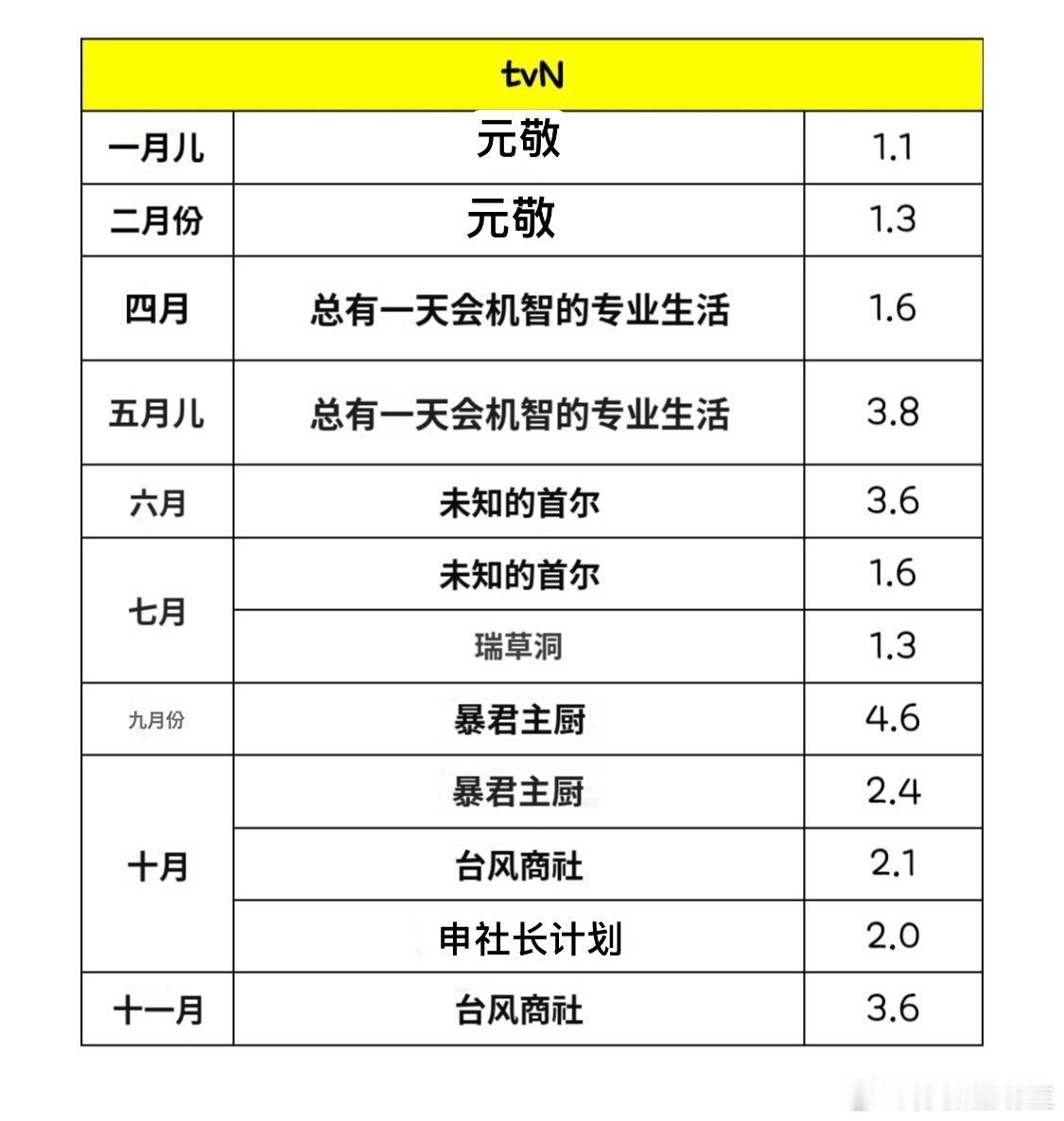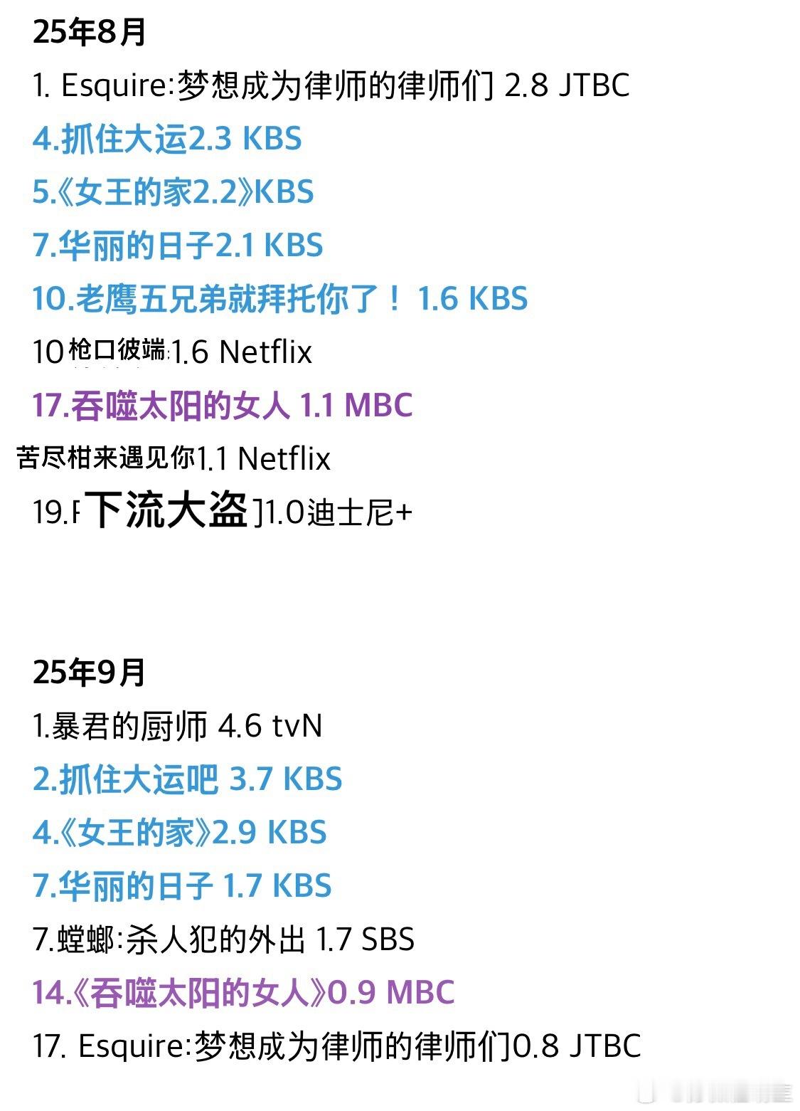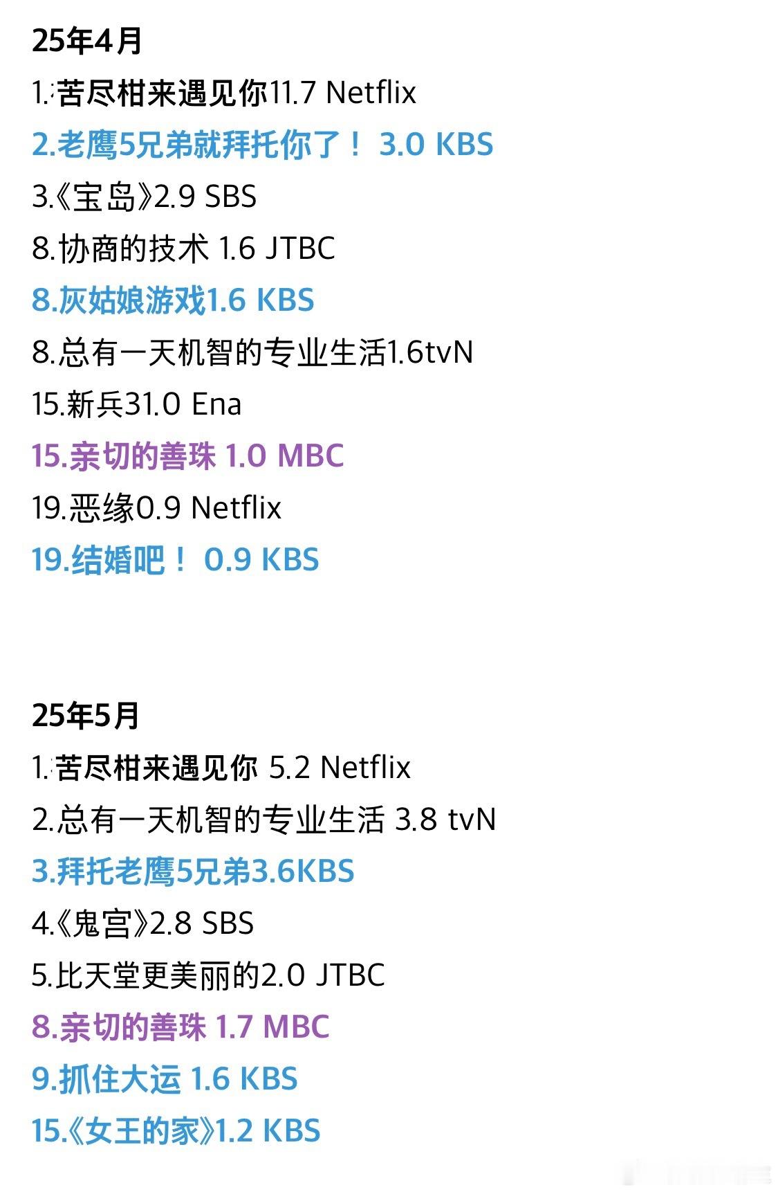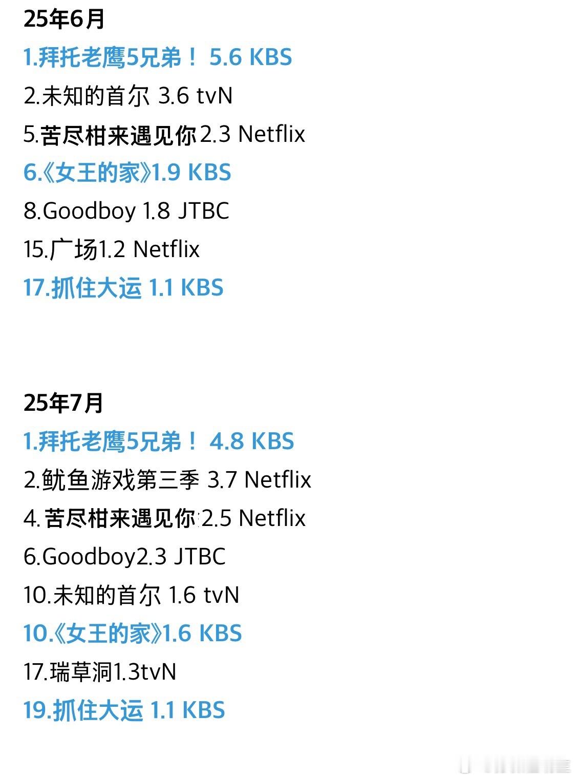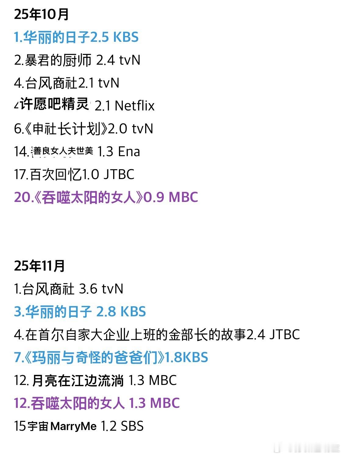 hgr总结的2025 OTT,各电视台『韩国人喜爱的节目』每月进入盖洛普的现状(~11月更新)前五名:苦尽柑来遇见你🍊进榜6次最高11.7鱿鱼游戏进榜3次最高5.6重症外伤中心进榜1次5.1暴君的主厨进榜2次最高4.6玉氏夫人传进榜2次最高4.3