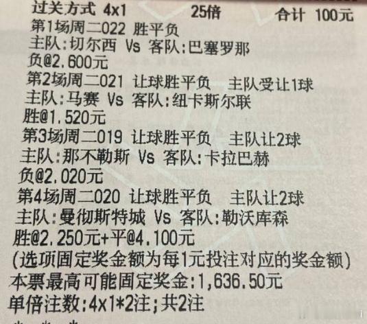 亮哥今日实单:周二019 欧冠 那不勒斯vs卡拉巴赫 周二020 欧冠 曼城vs勒沃库森 周二021 欧冠 马赛vs纽卡斯尔 周二022 欧冠 切尔西vs巴萨 亮哥今日二串推荐:022负 021让胜亮哥今日四串推荐:022负 021让胜 019让负 020让胜 让平