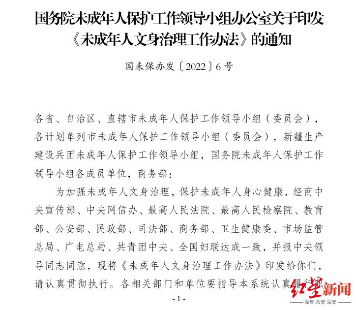 红星新闻记者检索发现,早在2022年国务院未成年人保护领导小组办公室经商与中央宣传部、中央网信办、最高人民法院、最高人民检察院、教育部、公安部等多部门达成一致,印发《未成年人文身治理工作办法》(以下简称《办法》)。这份《办法》也是上述《告知书》的依据之一。