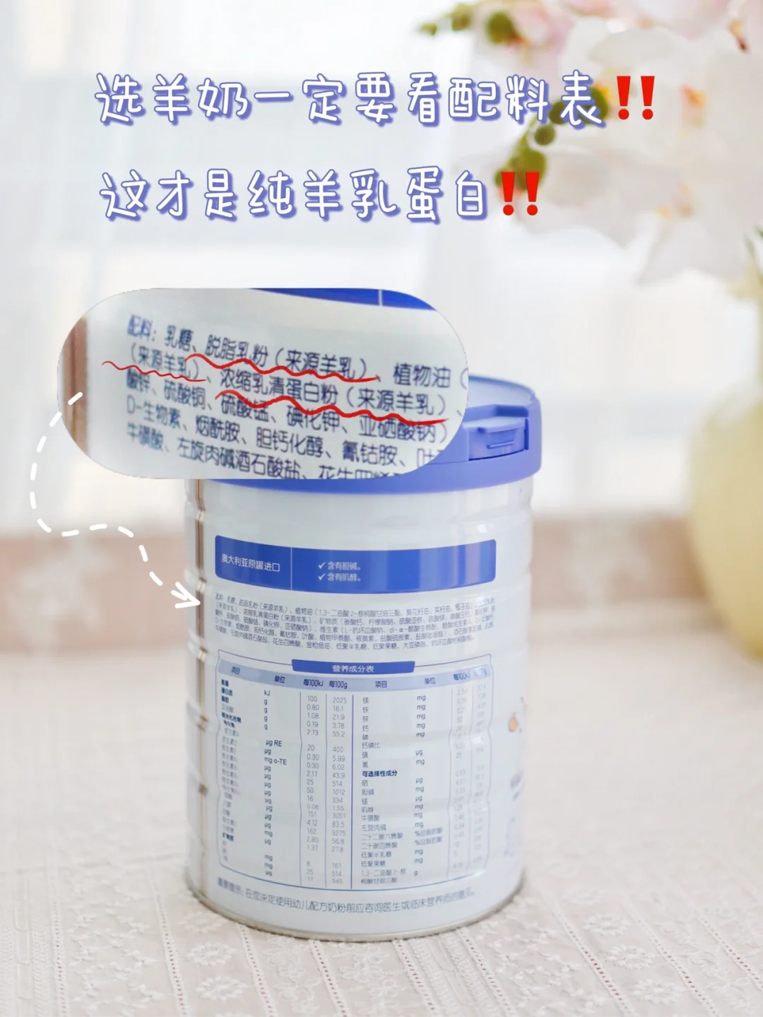 ⚠️选羊奶粉的时候1⃣️定要注意,配料表中如果🈶️乳清蛋白粉或脱盐乳清粉,1⃣️定要有注明来源是羊奶才行,不然可能有猫腻噢‼️