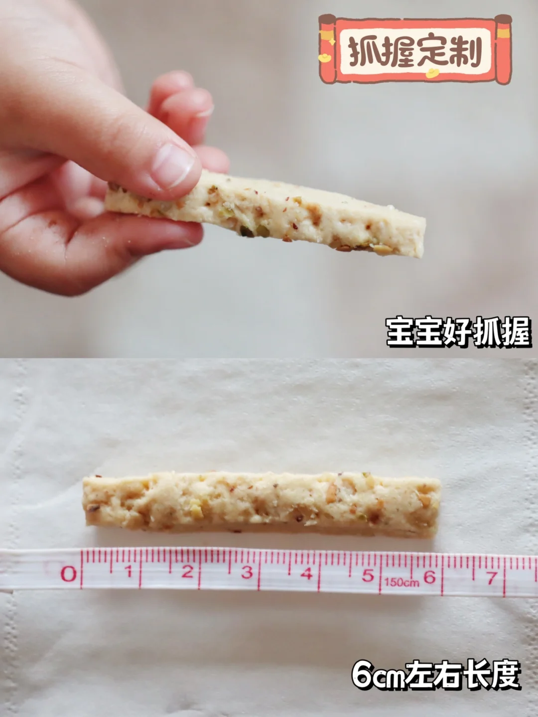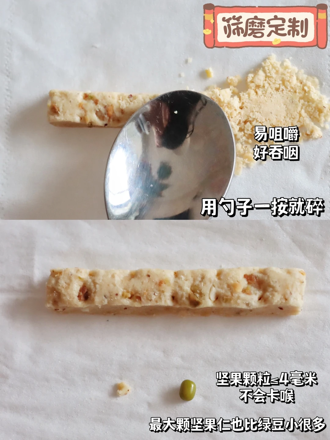 用手就能把坚果酥碾碎,看了下最大颗粒的坚果籽仁🌰,也不过几毫米(和绿豆比颗粒大小都要小很多),整体非常细腻,不用担心卡喉,可以放心吃👌