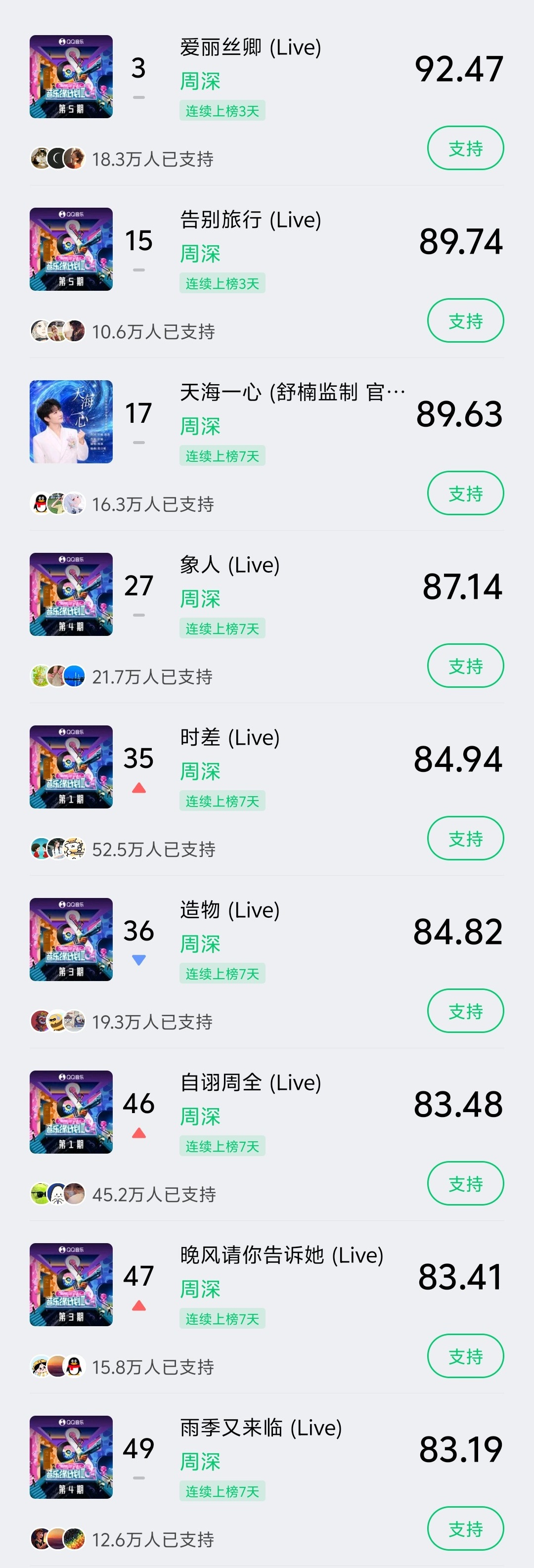 📣 11.25 巅峰潮流 📣米米们晚上好每歌做6个动作路径:Q音-乐馆-排行-潮流巅峰✅《爱丽丝卿(live)》✅《告别旅行(live)》✅《天海一心》✅《象人(live)》✅《时差(live)》✅《造物(live)》✅《自诩周全(live)》✅《晚风请你告诉她(live)》✅《雨季又来临(live)》完成『支持』让更多人听到深深