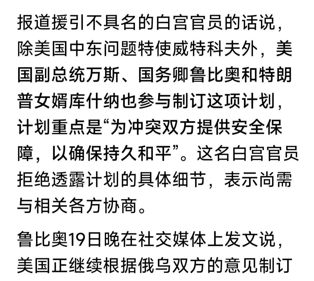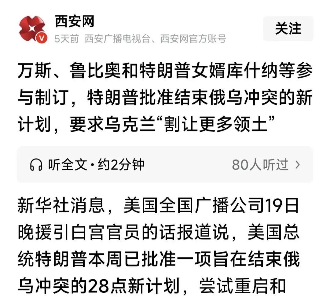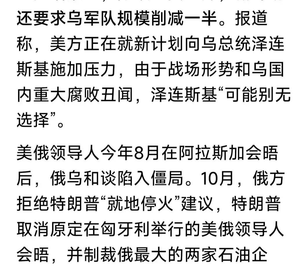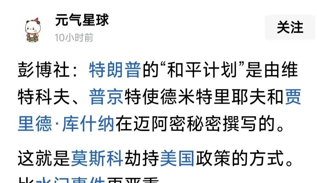 实锤!川普“俄乌和平28条”,是其女婿库什纳,与特使维特科夫,俄特使德米特里耶夫,历时数月秘密制定!副总统万斯和国务卿卢比奥,间接参与制定过程。要命是协议形成,不征求乌欧意见,就逼迫乌感恩节同意?世上哪有这种道理?战争双方是俄乌,美国只是调解人。岂能越俎代庖,越过乌与俄私下制定协议要乌就范? 这事闹到现在,已经不是简单的停战计划问题了。首先是美国国内的反应,民主党那边直接炸锅,众议院外交委员会立刻宣布展开调查,追问库什纳参与的细节——毕竟他是川普家人,不是正式官员,凭什么主导这么大的外交计划?共和党内也有不少人不满,觉得老特太急功近利,把选举利益放在前面,完全不顾盟友感受。更让人起疑的是,最初版28条里,有几条对俄特别有利:允许俄保留乌东四州实际控制,要求乌放弃加入北约诉求。这些都是俄一直想要的,库什纳和俄特使私下见过几次面,有没有承诺放松对俄制裁?虽无实锤证据,但这种暗箱操作本身就足够让人怀疑。 平心而论,川普想停战的初衷未必全是坏的,但做法完全错了。调解人最基本的原则是中立和透明,你绕过战争一方去和另一方谈,本身就是对乌主权的不尊重。乌打了这么久,死了那么多人,怎么可能接受别人替自己做决定?欧洲那边更不用说,他们和俄是邻居,战争持续对欧洲经济打击最大,但他们也不能接受一个牺牲乌利益的和平协议——毕竟欧洲一直标榜支持主权国家。 现在的情况是,新框架协议乌勉强能接受,但俄不干了。俄外交部发言人直接说,“模糊四州问题等于没解决核心矛盾”。这就陷入了死循环:乌要领土完整,俄要实际控制,美国想停战但两边都得罪不起。川普现在的处境很尴尬,派卢比奥去协商,结果乌欧坚持红线,俄又不退步,他明年选举的“和平牌”可能要砸了。 最要命的是那个“通俄门”的指控。如果真的查出库什纳和俄有私下交易,比如俄给川普选举提供资金支持,那川普不仅选举没戏,可能还要面临法律责任。毕竟水门事件只是窃听,这个要是坐实,就是叛国级别的丑闻了。现在就看调查能不能挖出实锤,这对川普来说是最大的定时炸弹。 战争还在继续,川普的和平计划能不能成?那个定时炸弹会不会爆炸?这些问题现在都没答案,但有一点可以肯定:不管谁想调解俄乌冲突,都得尊重双方的意愿,不然只会越搞越糟。这种越俎代庖的做法,从一开始就注定了失败的结局,老特要是不明白这个道理,后面的麻烦只会更多。