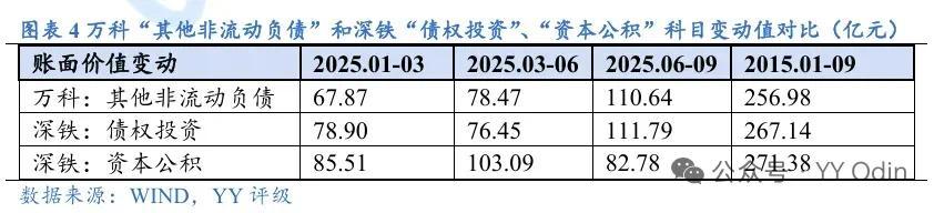 更值得注意的是,深铁支持万科资金主要来自深圳政府部门。YYOdin评级数据显示,截至2025年9月,深铁资产负债表中“资本公积”科目账面价值与“债权投资”科目变动接近,并且“资本公积”科目变动值明显超出以往年度,验证“因万科需要,政府向深铁注资”的逻辑。