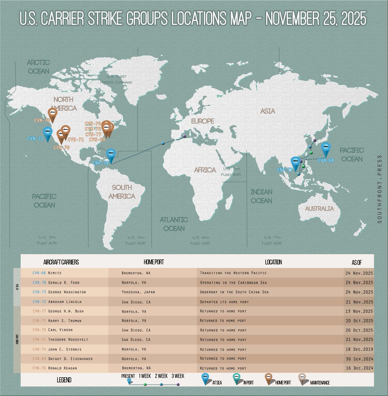 11月25日美国航母打击群部署位置。信息显示,除两艘航母外,其余航母基本都回到美