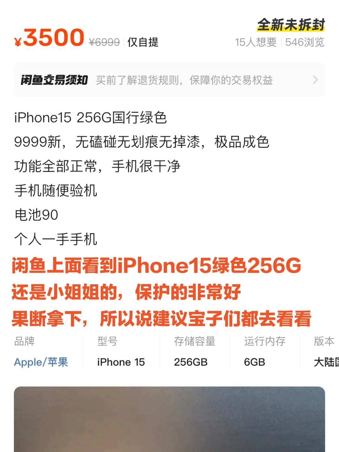 我最近在闲鱼APP上面入手了一台iPhone15♻️99新,手机很干净没有磕碰,256G当时6999 元,但是我只花了💰3500就拿到手了,是个小姐姐的手机全程套壳使用,才买了不到一年!省下了一半的💰