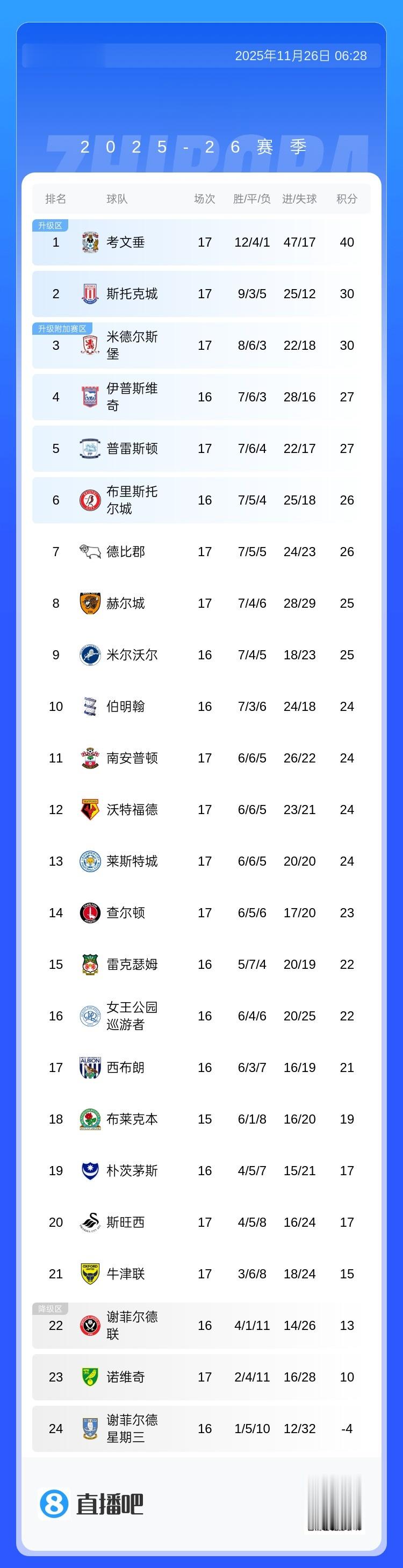 直播吧11月26日讯在本轮英冠,考文垂4-2击败积分榜排在第三位的米德尔斯堡。