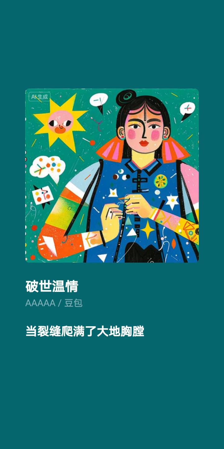 破世温情。 当黑夜吞没了所有星光,当裂缝爬满了大地胸膛,有双手托起破碎的月亮,把光种在每寸荒凉土壤。五千年的月光淬炼出钢铁脊梁,用脊梁撑起穹苍,让世界看见光的形状。你用中国智慧缝合沧桑,你用中国力量重塑穹苍。看东方破晓的锋芒,照亮世界每个远方。千万颗心跳动成太阳,亿万双手掌连成桥梁,把伤痕铸成勋章,在废墟上开出新希望。你用中国智慧缝合沧桑,你用中国力量重塑穹苍。听大地苏醒的回响,让世界听见中国声响。