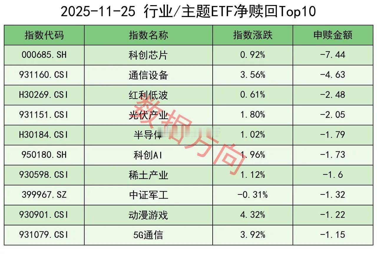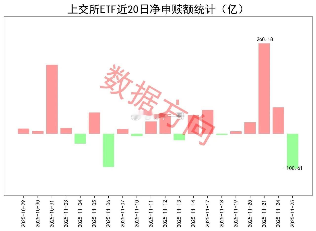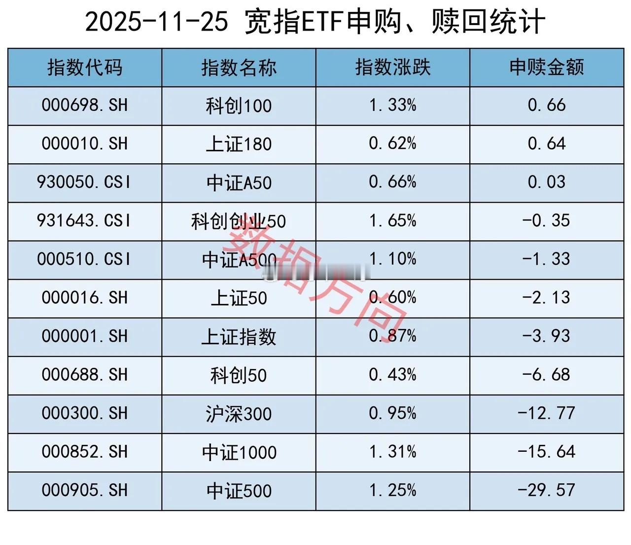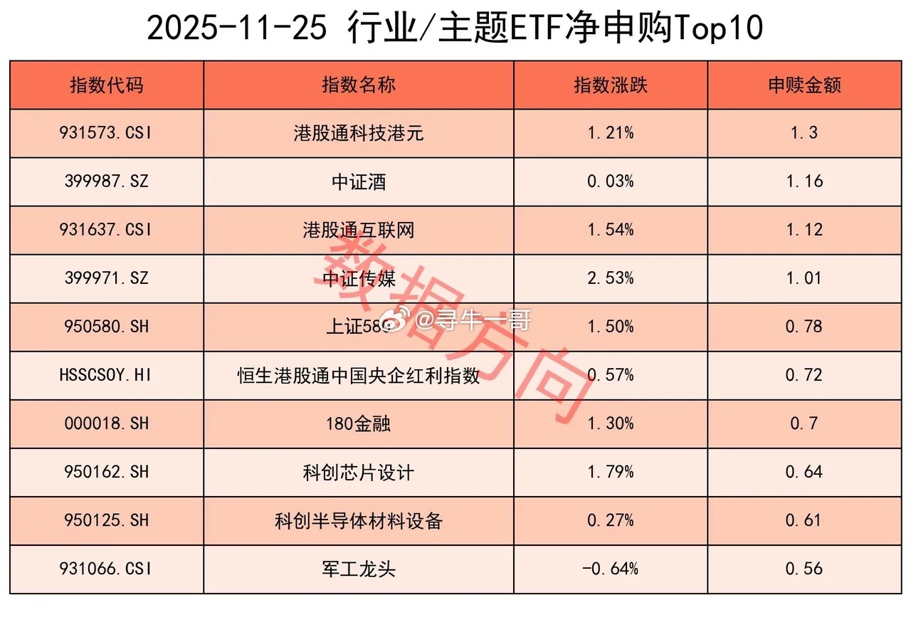 上交所ETF净赎回100亿!11月25日星期二,大盘高开高走、全线上涨,银行、AI应用与算力硬件涨幅居前。上证指数涨幅0.87%,上交所ETF合计净赎回100.61亿元。宽指仅有科创100指数(0.66亿)、上证180指数(0.64亿)、中证A50指数(0.03亿),获小幅净申购,金额都在1亿以内。中证500指数(-29.57亿),净赎回近30亿。中证1000指数(-15.64亿)、沪深300指数(-12.77亿),净赎回在10亿以上。科创50指数(-6.68亿),净赎回在5亿以上。上证指数(-3.93亿)、上证50指数(-2.13亿)、中证A500指数(-1.33亿)、科创创业50指数(-0.35亿),分别被小幅净赎回。行业和主题 资金流向较乱,存在打架的情况。中证传媒指数(1.01亿)进入申购榜;动漫游戏指数(-1.22亿)进入赎回榜。恒生港股通中国央企红利指数(0.72亿)进入申购榜;红利低波指数(-2.48亿)进入赎回榜。科创芯片设计指数(0.64亿)进入申购榜;科创芯片指数(-7.44亿)进入赎回榜。科创半导体材料设备指数(0.61亿)进入申购榜;半导体指数(-1.79亿)进入赎回榜。军工龙头指数(0.56亿)进入申购榜;中证军工指数(-1.32亿)进入赎回榜。港股通科技港元指数(1.3亿)、港股通互联网指数(1.12亿),一起进入申购榜。其他进入申购榜的还有:中证酒指数(1.16亿)、上证580指数(0.78亿)、180金融指数(0.7亿)。通信设备指数(-4.63亿)、5G通信指数(-1.15亿),一起进入赎回榜。其他进入赎回榜的还有:光伏产业指数(-2.05亿)、科创AI指数(-1.73亿)、稀土产业指数(-1.6亿)。