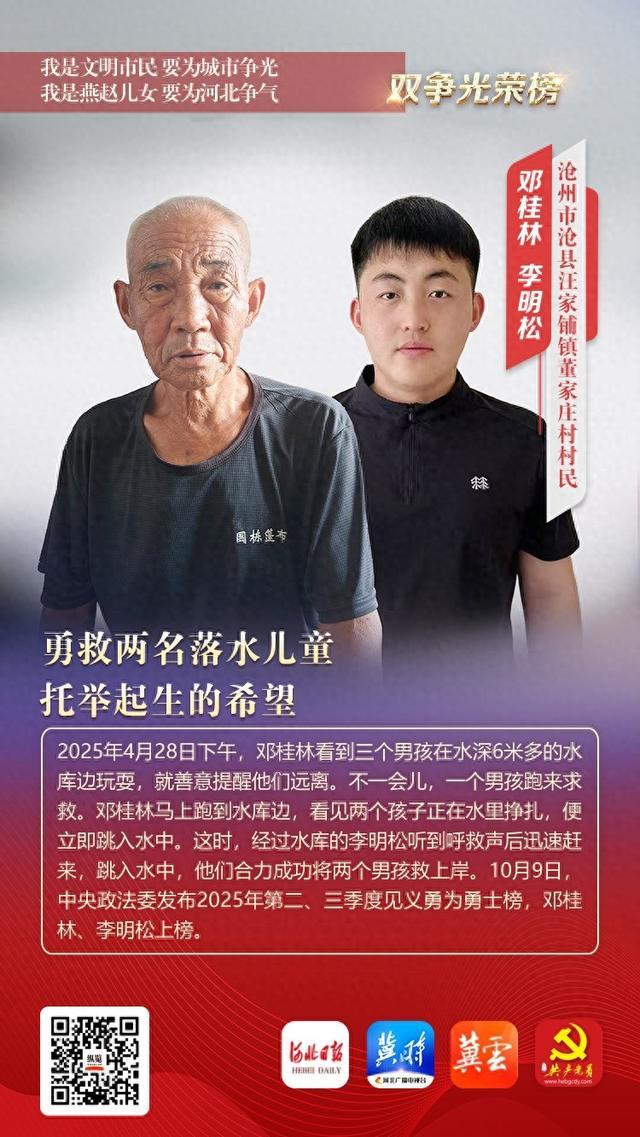 2025年4月28日下午,邓桂林看到三个男孩在水深6米多的水库边玩耍,就善意提醒他们远离。不一会儿,一个男孩跑来求救。邓桂林马上跑到水库边,看见两个孩子正在水里挣扎,便立即跳入水中。这时,经过水库的李明松听到呼救声后迅速赶来,跳入水中,他们合力成功将两个男孩救上岸。10月9日,中央政法委发布2025年第二、三季度见义勇为勇士榜,邓桂林、李明松上榜。