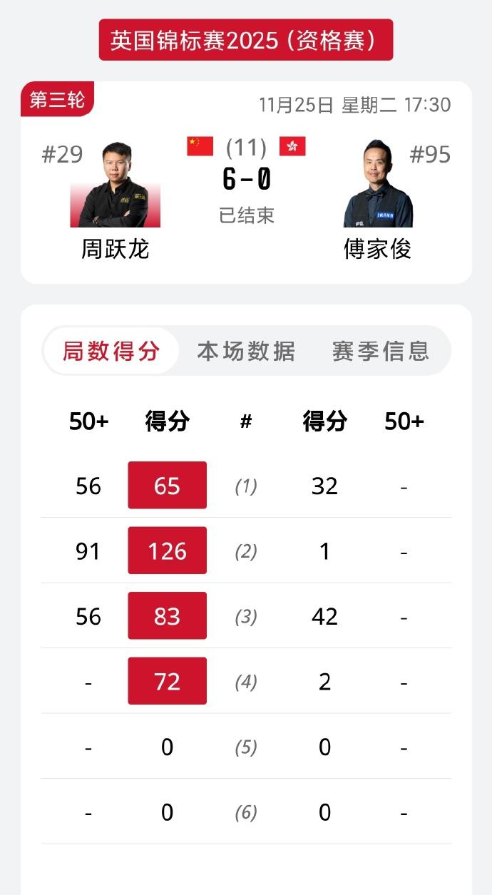 斯诺克:2025英锦赛资格赛中国选手一共9人闯入审判轮! 北京时间11月25日至次日凌晨,2025英锦赛资格赛结束第三轮的争夺,最终,共有9位中国球员亮相审判轮(第四轮,也就是48进32轮次!晋级成功将会亮相正赛与前十六种子对决)!他们分别是吕昊天、袁思俊、周跃龙、庞俊旭、龙泽煌、张安达、徐思、雷佩凡和国强。 另外不得不提的是,在昨天80进48轮次中,傅家俊在0-4落后周跃龙的情况下身体出现眼疾健康原因被迫中途退赛,周跃龙随之直接晋级48强,在此祝愿已经连续缺席4站赛事的傅家俊尽快恢复身体,继续上场比拼! 今天审判日降临!资格赛第4轮今天开打,32位选手将决出16个正赛席位。 今天21:00,袁思俊对阵霍尔特,吕昊天对阵曼恩。吉尔伯特、马奎尔出战; 凌晨时段,周跃龙对阵克拉克,宾汉姆、沃拉斯顿等出战。 赛果: 11月25日周二: (73)17:30 埃利奥特·斯莱塞 6-5 布尔丘·雷维斯 (74)17:30 马丁·奥德奈尔 5-6 扎克·舒尔第 (75)17:30 乔·奥康纳 6-4 斯蒂芬·霍尔沃斯 (76)17:30 本·沃拉斯顿 6-2 刘宏宇 (77)17:30 马修·塞尔特 2-6 杰米·克拉克 (78)17:30 周跃龙 6-0 傅家俊 (79)17:30 安东尼·麦克吉尔 1-6 斯科特·唐纳森 (80)17:30 斯图尔特·宾汉姆 6-5 利亚姆·普伦 (81)22:30 阿里·卡特 4-6 阿尔特米·齐津斯 (82)22:30 里奇·沃顿 3-6 大卫·利利 (83)22:30 庞俊旭 6-4 利亚姆·海菲尔德 (84)22:30 诺鹏·桑卡姆 6-3 米哈乌·苏巴尔奇克 (85)22:30 瑞恩·戴 6-1 利亚姆·格雷姆 (86)22:30 侯赛因·瓦菲 6-4 杜安·琼斯 (87)22:30 亚伦·希尔 1-6 龙泽煌 (88)22:30 杰克·利索夫斯基 2-6 路易·希斯科特 (89)次日3:30 张安达 6-1 阿兰·泰勒 (90)次日3:30 塔猜亚·乌努 6-1 罗比·威廉姆斯 (91)次日3:30 汤姆·福德 6-2 山姆·克雷吉 (92)次日3:30 徐思 6-4 杰米·琼斯 (93)次日3:30 吉米·罗伯逊 6-3 林杉峰 (94)次日3:30 雷佩凡 6-4 江俊 (95)次日3:30 国强 6-3 斯坦·穆迪 (96)次日3:30 杰克·琼斯 2-6 朱利安·勒克莱 赛程: 11月26日周三: 【以下为资格赛第四轮,48进32轮次】 (97)21:00 米歇尔·曼恩 vs 吕昊天 (98)21:00 袁思俊 vs 迈克尔·霍尔特 (99)21:00 伊安·伯恩斯 vs 斯蒂芬·马奎尔 (100)21:00 丹尼尔·威尔斯 vs 大卫·吉尔伯特 (101)次日3点 埃利奥特·斯莱塞 vs 扎克·舒尔第 (102)次日3点 乔·奥康纳 vs 本·沃拉斯顿 (103)次日3点 杰米·克拉克 vs 周跃龙 (104)次日3点 斯科特·唐纳森 vs 斯图尔特·宾汉姆 11月27日周四: (105)阿尔特米·齐津斯 vs 大卫·利利 (106)21:00 庞俊旭 vs 诺鹏·桑卡姆 (107)21:00 瑞恩·戴 vs 侯赛因·瓦菲 (108)龙泽煌 vs 路易·希斯科特 (109)次日3点 张安达 vs 塔猜亚·乌努 (110)次日3点 汤姆·福德 vs 徐思 (111)次日3点 吉米·罗伯逊 vs 雷佩凡 (112)次日3点 国强 vs 朱利安·勒克莱