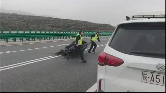 在强化全域巡查过程中,西安高速交警巡逻民警发现了这一处险情,随即上报警情,并同步启动“一路多方”应急联动机制。交警部门一方面迅速调度就近警力赶赴现场,在来车方向200米外设置锥形桶、警示闪光灯等警示标识,并利用车载扩音器引导后方车辆减速避让,另一方面协调交通执法部门对危险区域实施临时交通管制,防止车辆驶入危险路段。同时,对接路产养护部门,紧急调派专业抢险队伍抵达现场,交警与养护人员一起将有脱落风险的宣传横幅进行清理,恢复道路正常通行条件。