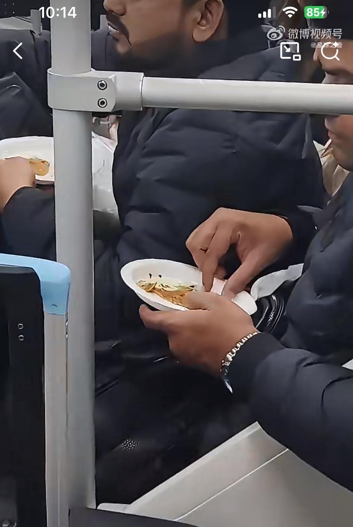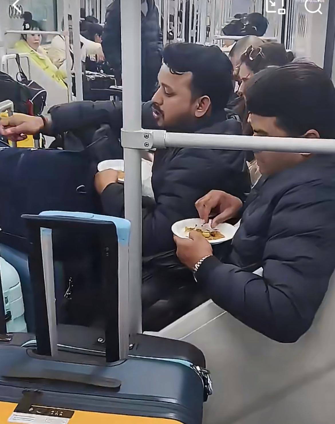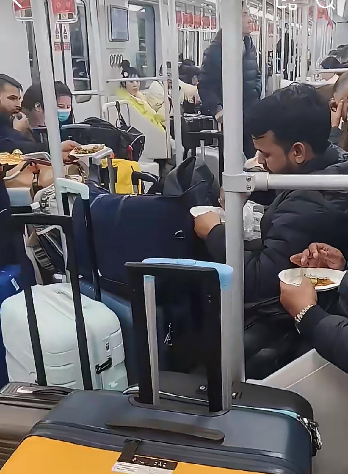 一群印度三哥男女把地铁当餐厅了,自在吃喝。看他们大包小包的行李,应该是刚下飞机坐上地铁,可能是饥肠辘辘,每人一个小餐盘,右手抓住食物大快朵颐,吃的好欢畅。这一队男男女女目测十来个,看穿着不像是印度穷人,他们是来旅游还是做生意的。印度就餐